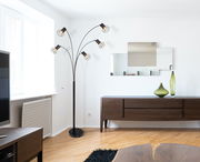 Diese Stehleuchte passt einfach hervorragend in jede Inneneinrichtung. Die Lampe ist mit E27-Fassungen versehen. Sie hat eine Gesamtbreite von 74 cm, eine Höhenabmessung von 204 cm sowie ein Tiefenmass von 80 cm. Die Stehlampe lässt sich mit fünf Leuchtmitteln bestücken. Sie hat eine Leistung in Höhe von 40 W, ist schwarz und besteht aus Metall. Mit dieser Stehlampe wird Ihr Zuhause noch geselliger und gemütlicher.
