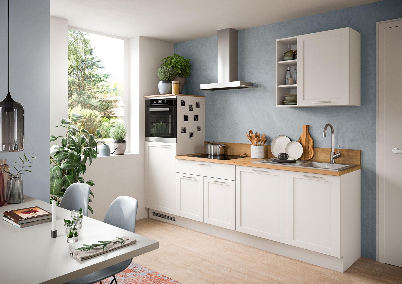 In Abhängigkeit von der Küchengröße und den persönlichen Ansprüchen wählen Sie mit wenigen Klicks Küchenzeilen ohne Geräte oder mit Geräten aus. Kochen Sie nur selten daheim und haben Sie nicht viel Platz, sind Mini-Küchen ideal, die auch als Singleküche oder Pantryküche bezeichnet werden. Sie verfügen über all das, was eine Basisausstattung in der Küche ausmacht: Kochplatten, Einlassbecken, Arbeitsplatte und Schränke für hinreichend Stauraum. Die klassischen Küchenzeilen sind deutlich breiter. Die Ober- und Unterschränke bieten für sämtliche Küchenutensilien und Geschirr sowie Lebensmittel Platz. Backofen- und Kühlumbauschränke sind ebenfalls vorhanden. Manchmal ist bereits eine Dunstabzugshaube dabei.