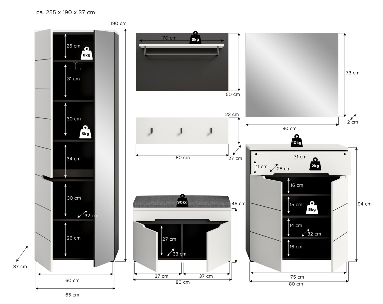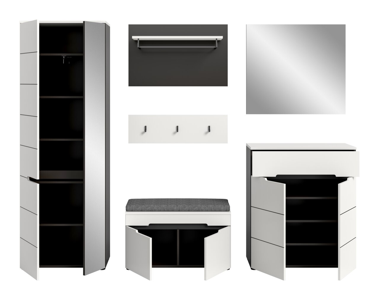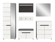 Garderobenkombination CANU: Stilvolles und funktionales Highlight Die Garderobenkombination CANU ist die perfekte Lösung für alle, die Wert auf stilvolles und funktionales Design legen. Das Set bietet nicht nur genügend Platz für Ihre Garderobe, sondern auch eine praktische Sitzbank für bequemes An- und Ausziehen der Schuhe. Die Kombination aus weißen Fronten und einem basaltgrauen Korpus verleiht Ihrem Eingangsbereich einen modernen Look. Entdecken Sie die Möglichkeiten, die diese durchdachte Kombination für Ihr Zuhause bietet. Bringen Sie jetzt frischen Wind in Ihren Flur und bestellen Sie noch heute!