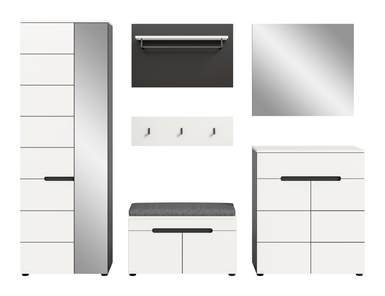 Die MID.YOU Garderobenkombination CANU vereint modernes Design mit praktischer Funktionalität und bringt frischen Wind in Ihren Eingangsbereich. Die Kombination besticht durch ihre stilvolle Farbgebung in Weiß und Basaltgrau, die Ihrem Zuhause eine elegante Note verleiht. Die grifflosen Drehtüren unterstreichen das minimalistische Design, während die Holznachbildung für eine robuste und pflegeleichte Oberfläche sorgt. Mit insgesamt sechs Türen und einer Schublade bietet die Garderobenkombination ausreichend Stauraum für Kleidung, Schuhe und Accessoires. Der Garderobenschrank, die Schuhkommode, die Sitzbank mit Sitzkissen, das Paneel, die Hakenleiste und der Spiegel ergänzen sich zu einem harmonischen Gesamtbild.