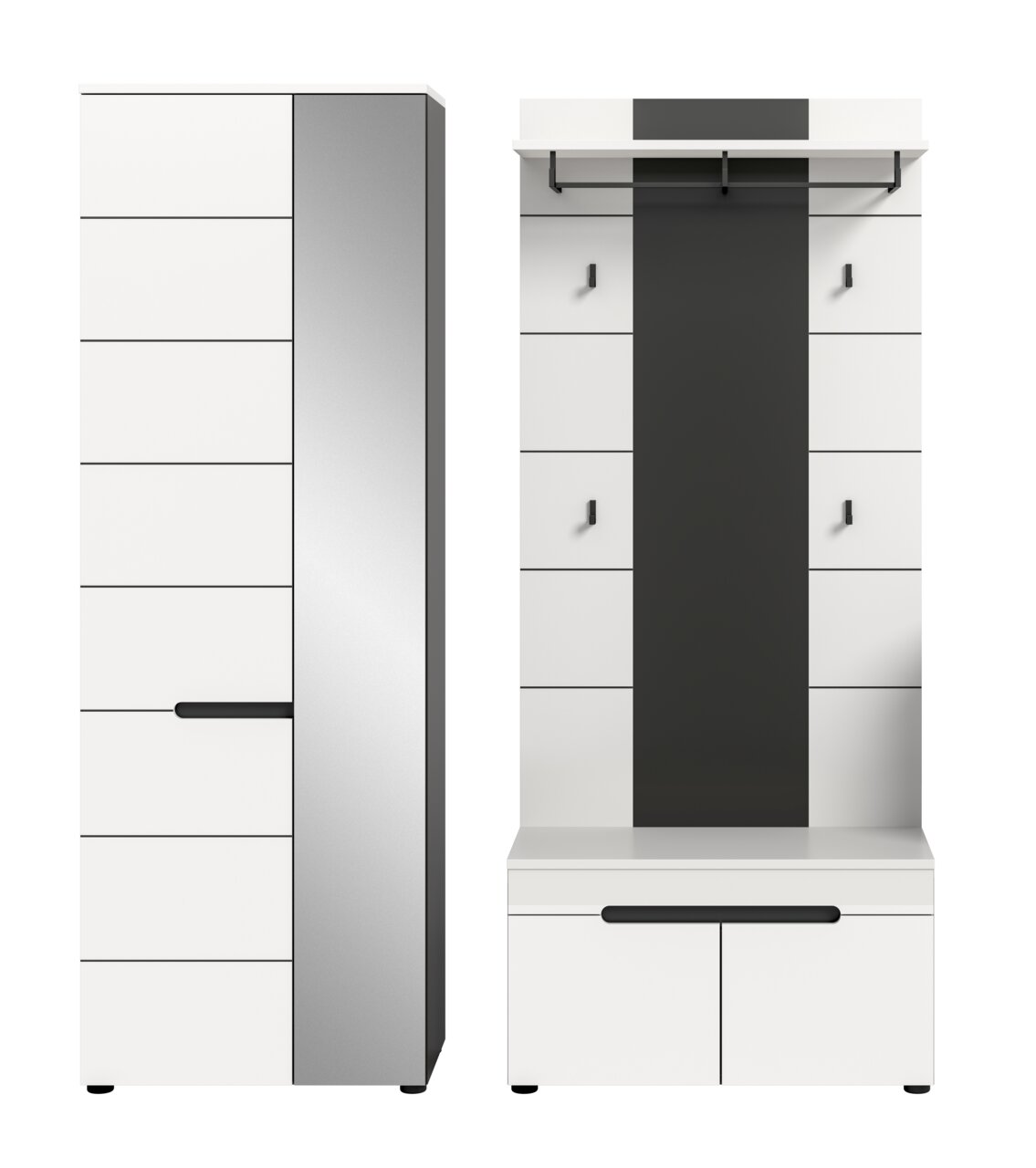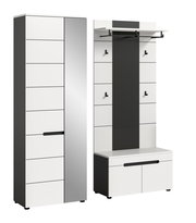 Die Garderobenkombination CANU von MID.YOU verbindet modernes Design mit praktischer Funktionalität und ist die perfekte Ergänzung für Ihren Eingangsbereich. Mit ihrem trendigen Stil und der harmonischen Farbkombination aus einer weißen Front und einem basaltgrauen Korpus setzt sie stilvolle Akzente in jedem Raum. Die Front in Weiß Nachbildung und der Korpus in Basalt grau Nachbildung verleihen dem Möbelstück eine elegante Ausstrahlung. Die Kombination aus Garderobenschrank, Sitzbank und Paneel bietet vielfältige Aufbewahrungsmöglichkeiten. Die grifflosen Türen, aus Holznachbildung gefertigt, sorgen für eine klare und puristische Optik. Vier Drehtüren bieten ausreichend Platz für Ihre Garderobe.
