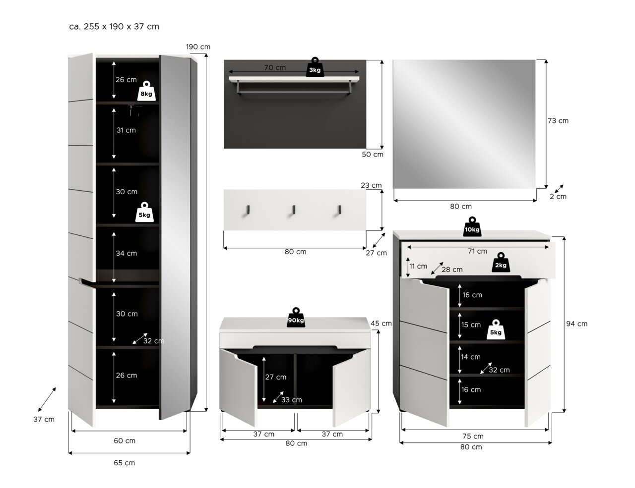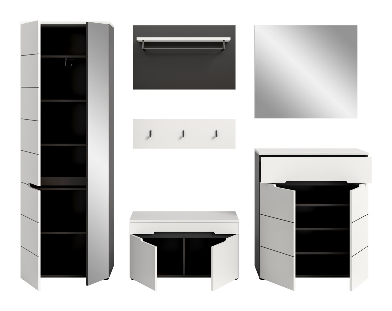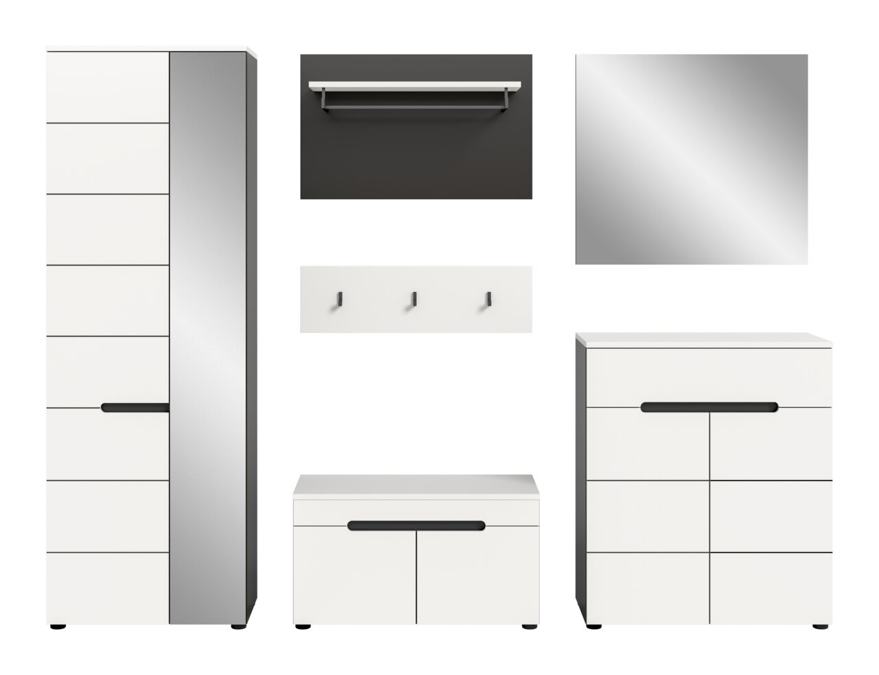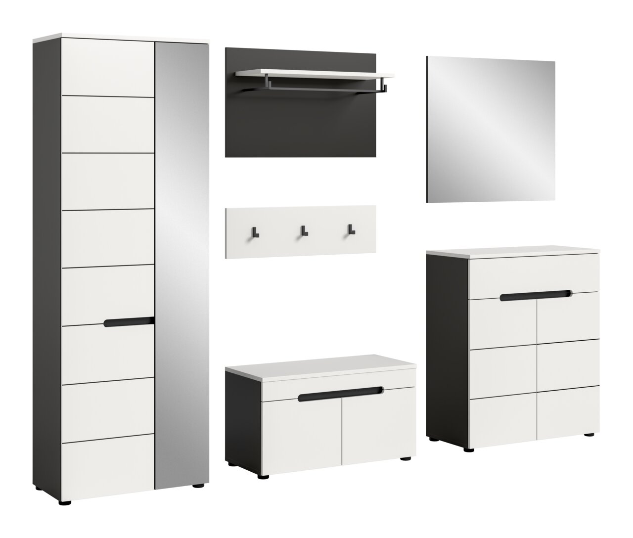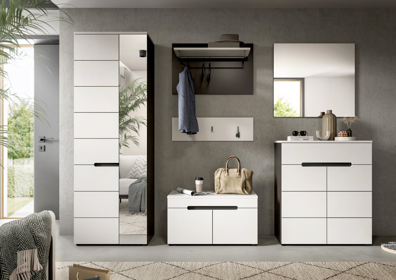 Erleben Sie modernen Stil und trendiges Design mit der MID.YOU Garderobenkombination CANU. Diese elegante Lösung bietet eine harmonische Kombination aus funktionalem Design und ästhetischer Anziehungskraft. Die Front in Weiß und der Korpus in Basaltgrau Nachbildung schaffen ein ansprechendes Ambiente, das sich perfekt in zeitgemäße Wohnkonzepte einfügt. Die grifflosen Türen und die klare Linienführung unterstreichen das minimalistische Design dieser Garderobenkombination. Mit sechs Drehtüren, einer praktischen Schublade und einer Vielzahl an Bestandteilen wie Garderobenschrank, Sitzbank, Paneel, Hakenleiste, Schuhkommode und Spiegel bietet sie alles, was Sie für einen aufgeräumten Eingangsbereich benötigen.