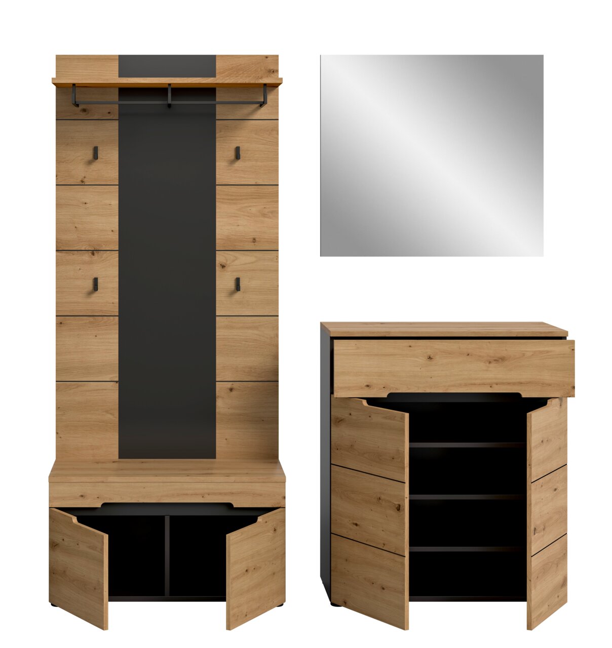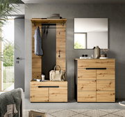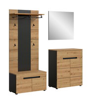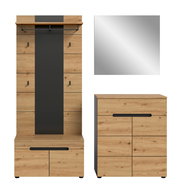 Garderobenkombination CANU – Funktion trifft DesignDie Garderobenkombination CANU ist die perfekte Wahl für alle, die Wert auf Trend und Funktion legen. Mit vier Drehtüren und einer Schublade bietet sie ausreichend Platz für Schuhe, Accessoires und Alltagsgegenstände. Der geschmackvolle Mix aus Eiche Artisan und Basaltfarben sorgt für einen modernen Look und fügt sich nahtlos in verschiedene Wohnstile ein. Die grifflosen Türen unterstreichen das minimalistische Design und sorgen für ein aufgeräumtes Erscheinungsbild. Entdecken Sie die perfekte Balance zwischen Stil und Funktionalität und gestalten Sie Ihren Eingangsbereich neu. Jetzt ist der ideale Zeitpunkt, um Ihren Wohnraum zu verwandeln!