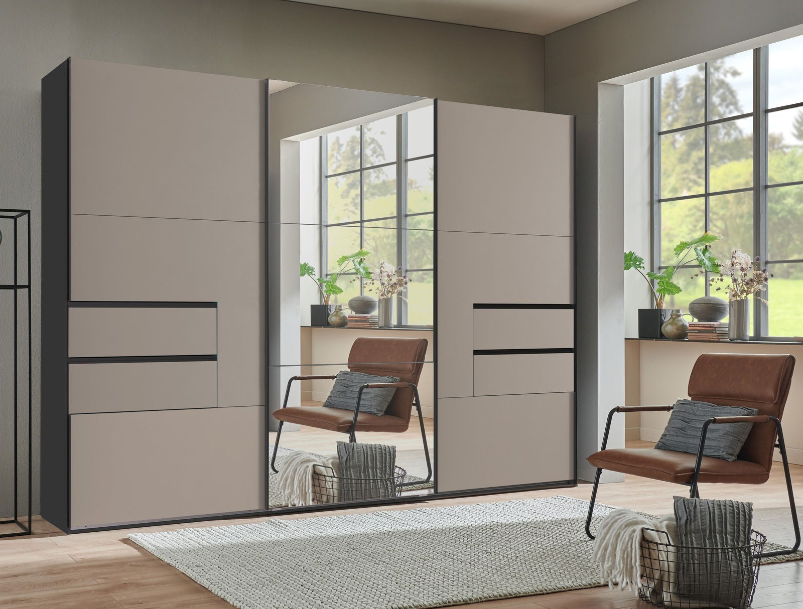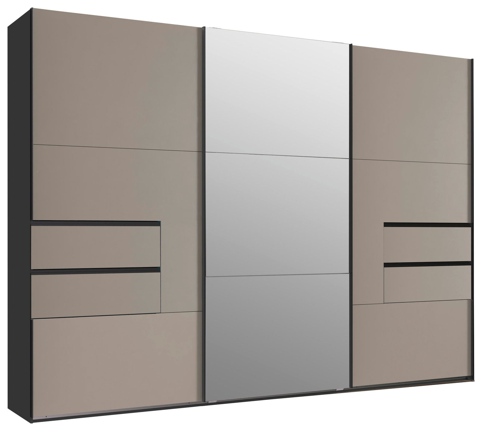 Der Schwebetürenschrank PALERMO von MID.YOU ist die perfekte Wahl für ein modernes und trendiges Schlafzimmerambiente. Mit seiner eleganten Saharagrau-Front und dem kontrastierenden Graphit-Korpus bringt dieser Schrank einen Hauch von Raffinesse in Ihre Einrichtung. Die drei Schwebetüren gleiten sanft und leise, dank des integrierten Softclose-Mechanismus, und bieten einen einfachen Zugang zu Ihrer Garderobe. Der Schrank besticht nicht nur durch sein ansprechendes Äußeres, sondern auch durch seine Funktionalität. Die vier integrierten Schubladen bieten zusätzlichen Stauraum und sorgen für Ordnung und Übersichtlichkeit. Gefertigt aus hochwertiger Holznachbildung, verbindet der Schrank Langlebigkeit mit modernem Design.