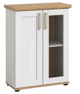 Die Vitrine VERONA von MID.YOU bringt modernes und stilvolles Design in Ihr Zuhause. Die Kombination aus sibiu Lärche Nachbildung und Akzent in Artisan Eiche Nachbildung verleiht diesem Möbelstück eine unverwechselbare Optik. Die Front und der Korpus in elegantem Weiß harmonieren perfekt mit den silberfarbenen Kunststofffüßen. Die Vitrine verfügt über zwei Drehtüren, die den Zugang zu großzügigem Stauraum ermöglichen. Die Bügelgriffe unterstreichen das trendige und zeitgemäße Design und sorgen für eine einfache Handhabung. Diese Vitrine ist nicht nur ein praktisches Möbelstück, sondern auch ein echter Blickfang in jedem Raum.