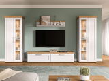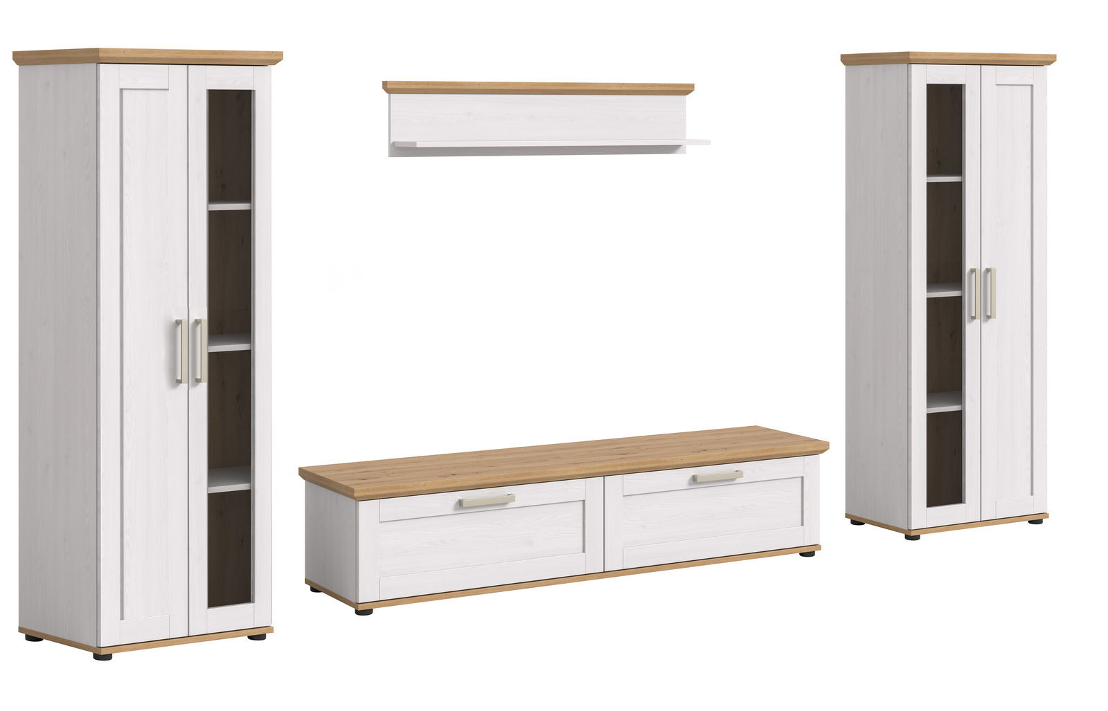 Wohnkombination VERONA: Funktionalität trifft Design Die Wohnkombination VERONA bietet nicht nur visuelle Attraktivität, sondern auch praktische Lösungen für Ihr Zuhause. Die robusten Korpusse in Weiß harmonieren perfekt mit den silbernen Kunststofffüßen und bieten Stabilität und Langlebigkeit. Die Türen aus Holznachbildung lassen sich mühelos öffnen und schließen, während die Vitrinen Ihre Lieblingsstücke stilvoll präsentieren. Dieses Möbelstück ist ein Muss für jeden, der modernes Design mit praktischer Funktionalität verbinden möchte. Verleihen Sie Ihrem Wohnzimmer ein neues Flair und erleben Sie die perfekte Kombination aus Stil und Nutzen. Jetzt entdecken und inspirieren lassen!