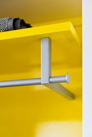 Die Cassando Garderobe "PASSARE" sorgen mit ihrem hochglanzlackierten Paneel in Gelb, dem anthrazitfarbenen Sitzkissen sowie dem großen Spiegeleinsatz für einen eleganten Blickfang. Mattweiße Fronten sowie mattsilberne Stangengriffe verleihen den klar strukturierten Elementen zurückhaltende Noblesse.