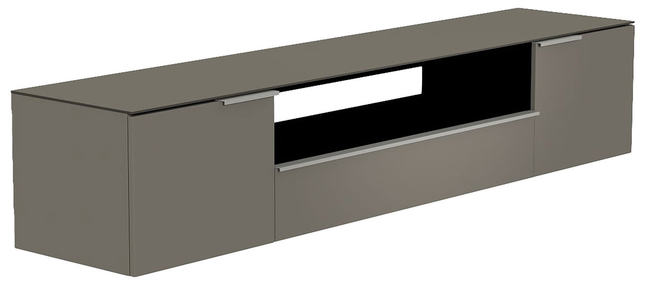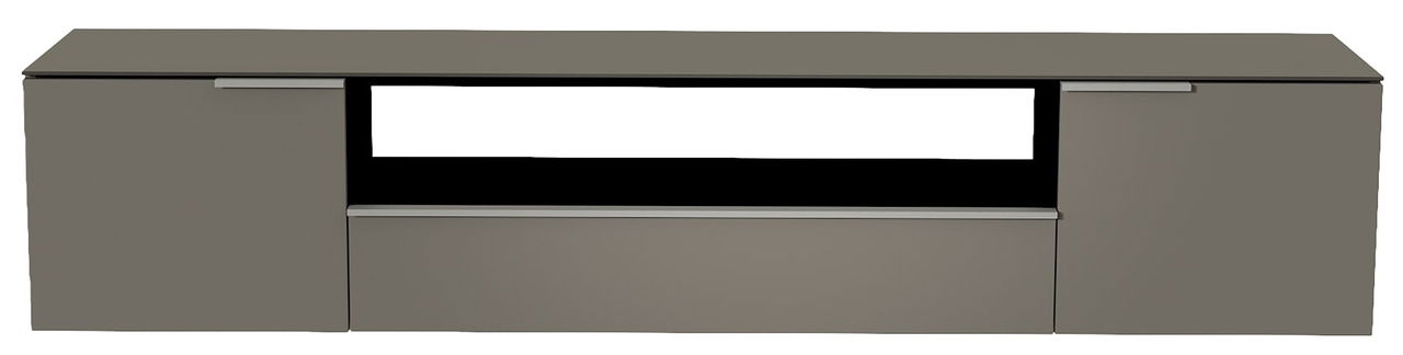 Durch mattgraue Lackfronten und eine mattgraue Printglas-Oberplatte unterstützt das Moderano XL-Hänge-Lowboard "BORMIO" minimalistisch geprägte Wohnkonzepte. Fein akzentuiert von alufarbenen Metallgriffen und dem schwarzen Mittelfach fügt sich das Möbel jedem räumlichen Farbgeschmack.