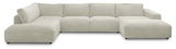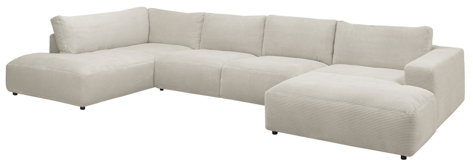 Entdecken Sie das Musterring Ecksofa MR LUCIA, das den modernen Stil perfekt verkörpert. Mit seinem eleganten Cord-Bezug in Light Grey fügt es sich nahtlos in jedes zeitgenössische Wohnambiente ein. Die großzügige Sitzhöhe von 43 cm und die beeindruckende Sitztiefe von 81 cm bieten optimalen Komfort für entspannte Stunden. Die hochwertige Polsterung aus Nosagunterfederung und PU-Schaum sorgt für eine ausgezeichnete Unterstützung und Langlebigkeit. Das Sofa besteht aus einem Longchair mit Armteil rechts, einem 2-Sitzer Sofa und einer Umbauecke mit Hocker, jeweils mit Rückenkissen ausgestattet. Der Rücken ist komplett mit echtem Stoff bezogen und bietet somit Flexibilität bei der Platzierung im Raum.