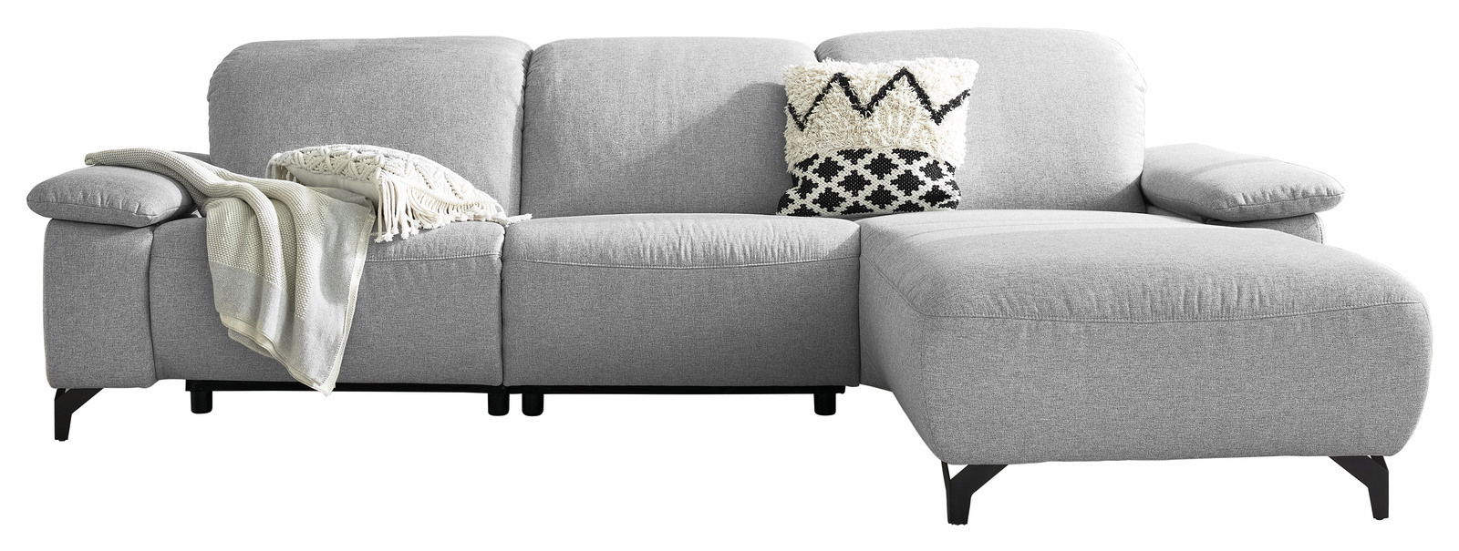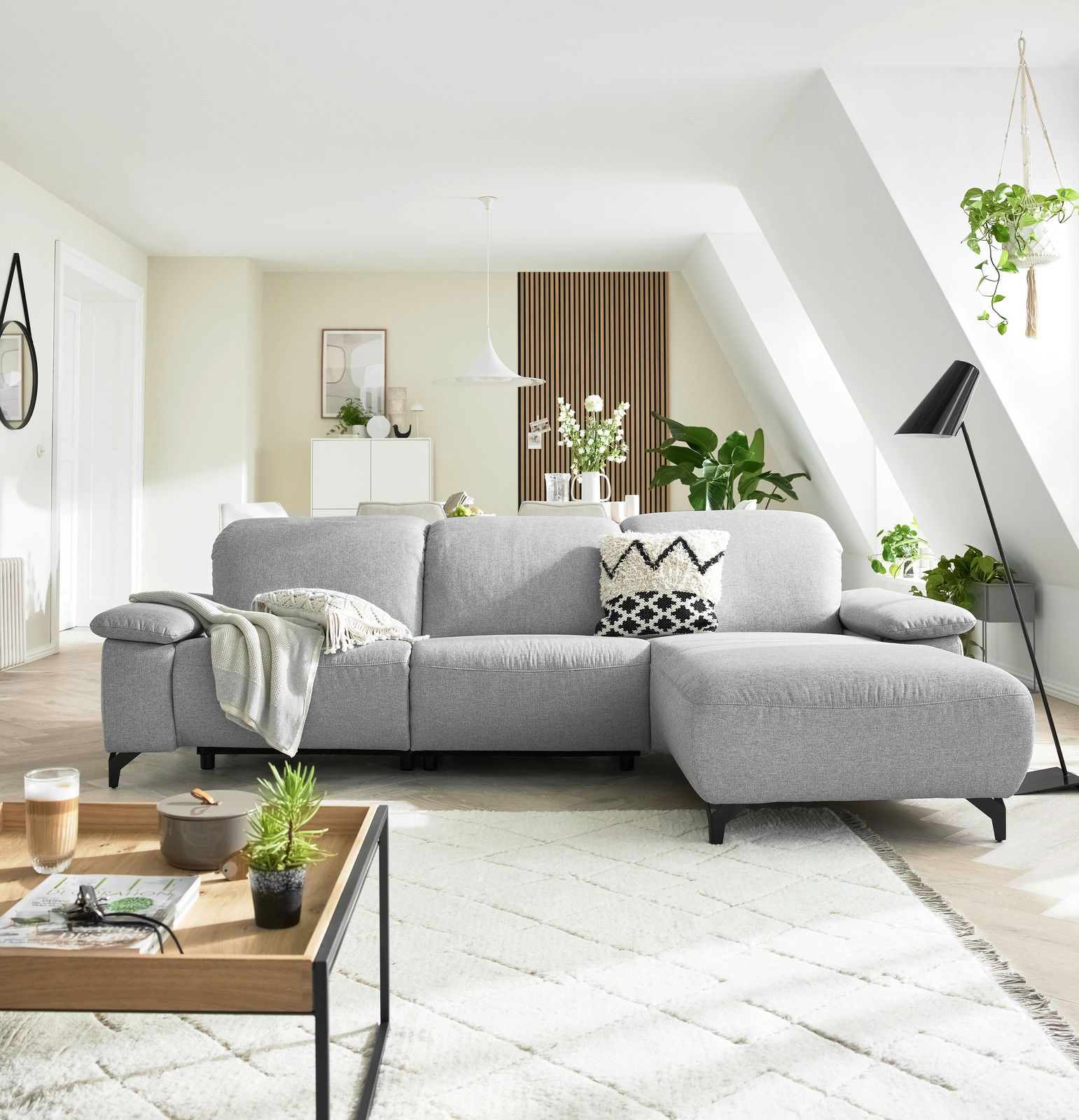 Erleben Sie modernen Komfort mit der Musterring Longchairkombination MR 370. Diese stilvolle Kombination aus Stoff in der eleganten Farbe famous silver bildet das Herzstück Ihres Wohnzimmers. Die Kombination besteht aus einem Sofa 1,5er medium mit Armteil links, einem Sofa 1,5er medium ohne Armteil und einem Longchair mit Armteil rechts. Jedes Element zeichnet sich durch eine hochwertige Nosagunterfederung aus, die für optimalen Sitzkomfort sorgt. Der Sitz bietet eine angenehme Höhe von 47 cm und eine großzügige Sitztiefe von 56 cm, während die manuelle Kopfteilverstellung zusätzliche Unterstützung bietet. Die schwarzen Metallfüße runden das moderne Design perfekt ab.