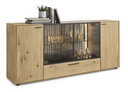 Das Musterring Sideboard TARGO vereint edles Design mit hochwertiger Verarbeitung. Gefertigt aus massiver Kerneiche und sandgestrahlt, strahlt es natürliche Eleganz aus. Das Sicherheitsglas und die Griffdetails unterstreichen die harmonische Kombination aus Robustheit und Stil. Mit seinen zwei Holztüren, zwei Glastüren und einer Schublade bietet es reichlich Stauraum und Flexibilität. Die LED-Rückwandbeleuchtung setzt Ihre Lieblingsstücke geschickt in Szene, während die Echtholzqualität für Langlebigkeit sorgt. Die stehende Aufstellmöglichkeit macht dieses Sideboard zu einem vielseitigen und praktischen Möbelstück für Ihr Zuhause.