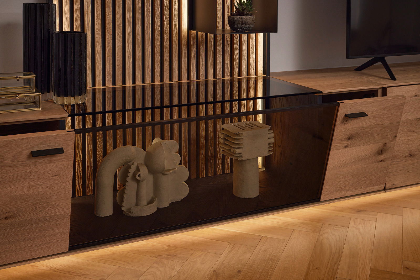 Die Musterring Wandkombination TARGO vereint hochwertige Materialien und stilvolles Design. Gefertigt aus massivem Echtholz in Kerneiche natur massiv, beeindruckt sie mit einer sandgestrahlten Oberfläche und Lamellen in Kerneiche. Das Sicherheitsglas sorgt für zusätzliche Robustheit und Langlebigkeit. Die harmonisch abgestimmte Farbgebung in Braun und Kerneiche macht diese Wandkombination zu einem eleganten Blickfang in jedem Wohnraum. Mit ihren anthrazitfarbenen Griffen und der umfassenden LED-Beleuchtung bringt sie sowohl Funktionalität als auch Ästhetik in Ihr Zuhause.