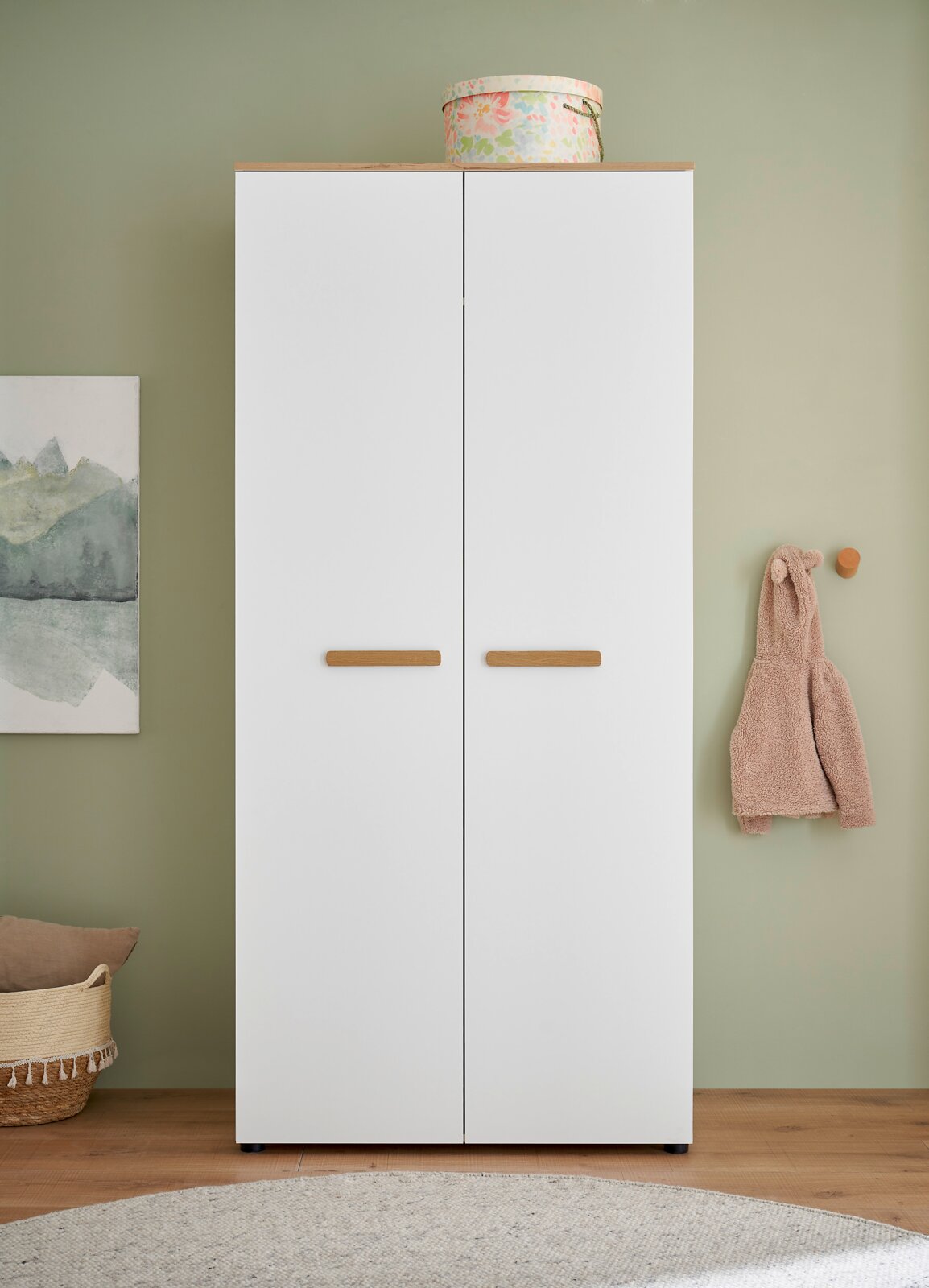 Kleiderschrank ASTEA – Funktion trifft Stil Der MyBaby Kleiderschrank ASTEA ist die perfekte Lösung für alle, die Wert auf Design und Funktionalität legen. Die zwei Drehtüren bieten einen einfachen Zugriff auf den Stauraum, während die weiße Farbgebung ein Gefühl von Raum und Frische vermittelt. Der Korpus und die Front in Holznachbildung verleihen dem Kleiderschrank eine natürliche Optik, die sich nahtlos in jedes moderne Ambiente einfügt. Lassen Sie sich von der Kombination aus Ästhetik und Praktikabilität begeistern und schaffen Sie einen eleganten Ort der Ordnung in Ihrem Zuhause. Bestellen Sie noch heute Ihren MyBaby Kleiderschrank ASTEA und erleben Sie stilvolle Wohnlichkeit.