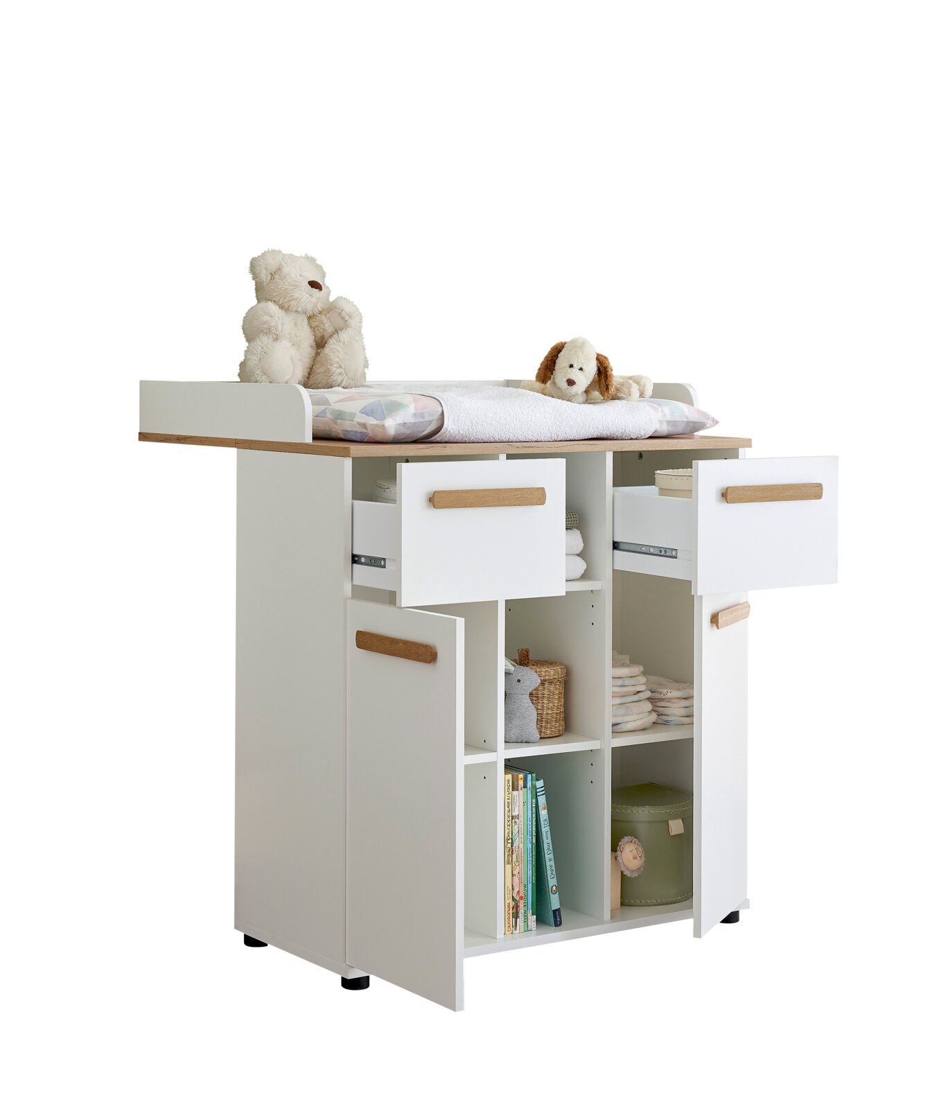 Erleben Sie die perfekte Kombination aus Stil und Funktionalität mit der Wickelkommode ASTEA im modernen Design. Die elegante weiße Optik, sowohl bei den Fronten als auch beim Korpus, verleiht jedem Raum eine frische und zeitlose Atmosphäre. Die Kommode ist aus hochwertiger Holznachbildung gefertigt und bietet nicht nur optische Schönheit, sondern auch praktische Vorteile. Mit zwei Drehtüren und zwei Schubladen ausgestattet, bietet sie ausreichend Stauraum für die Wickelutensilien Ihres Babys. Der inklusive Wickelaufsatz sorgt für zusätzlichen Komfort und Sicherheit beim Wickeln. Ein Griffdesign rundet das harmonische Gesamtbild ab.