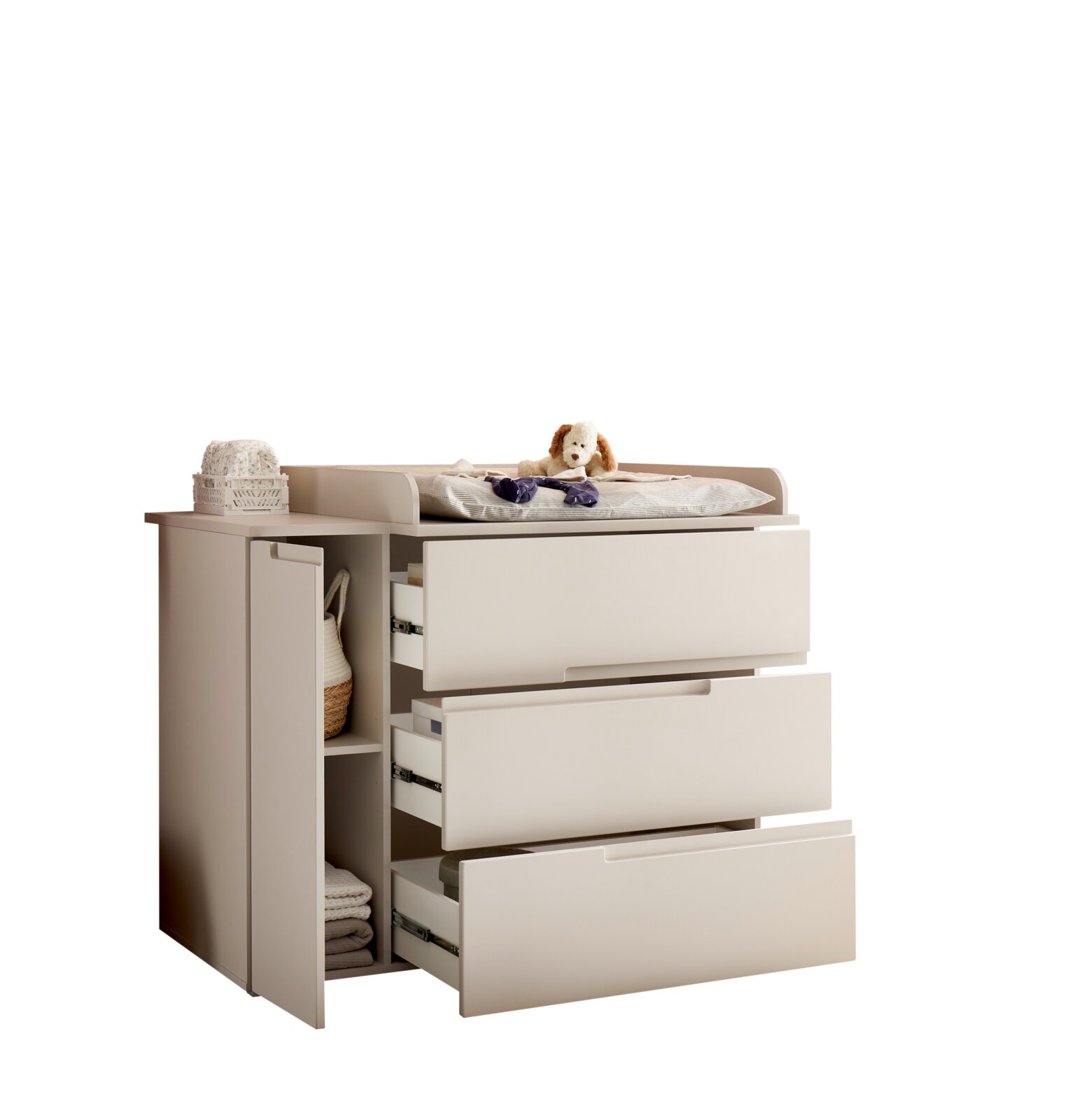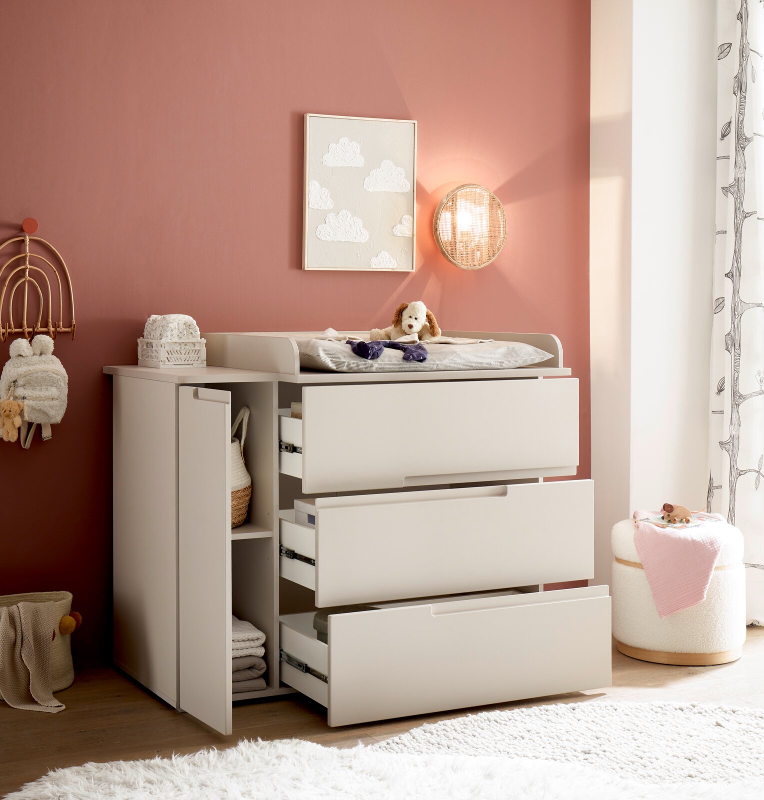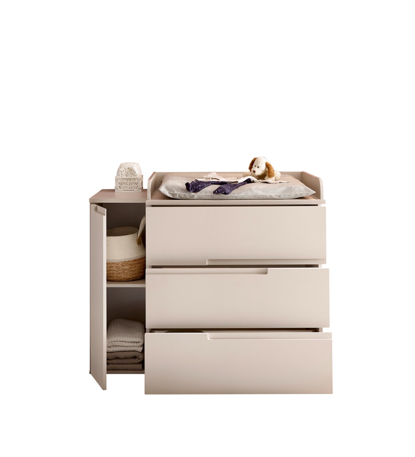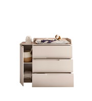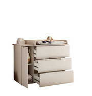 Die Wickelkommode MyBaby PEPPINI vereint modernes Design mit funktionaler Eleganz. In einem stilvollen Kaschmir-Ton gehalten, fügt sich dieses Möbelstück nahtlos in zeitgemäße Wohnräume ein. Die Griffmulden verleihen der Kommode eine edle Ästhetik, während die Drehtür und drei geräumige Schubladen reichlich Stauraum für alle Wickelutensilien bieten. Der hochwertige Wickelaufsatz sorgt für eine sichere und komfortable Wickeloberfläche, während die Holznachbildung dem Möbelstück eine warme, einladende Ausstrahlung verleiht. Genießen Sie die perfekte Kombination aus Stil und Funktionalität, die das Wickeln Ihres Babys zu einem angenehmen Erlebnis macht.