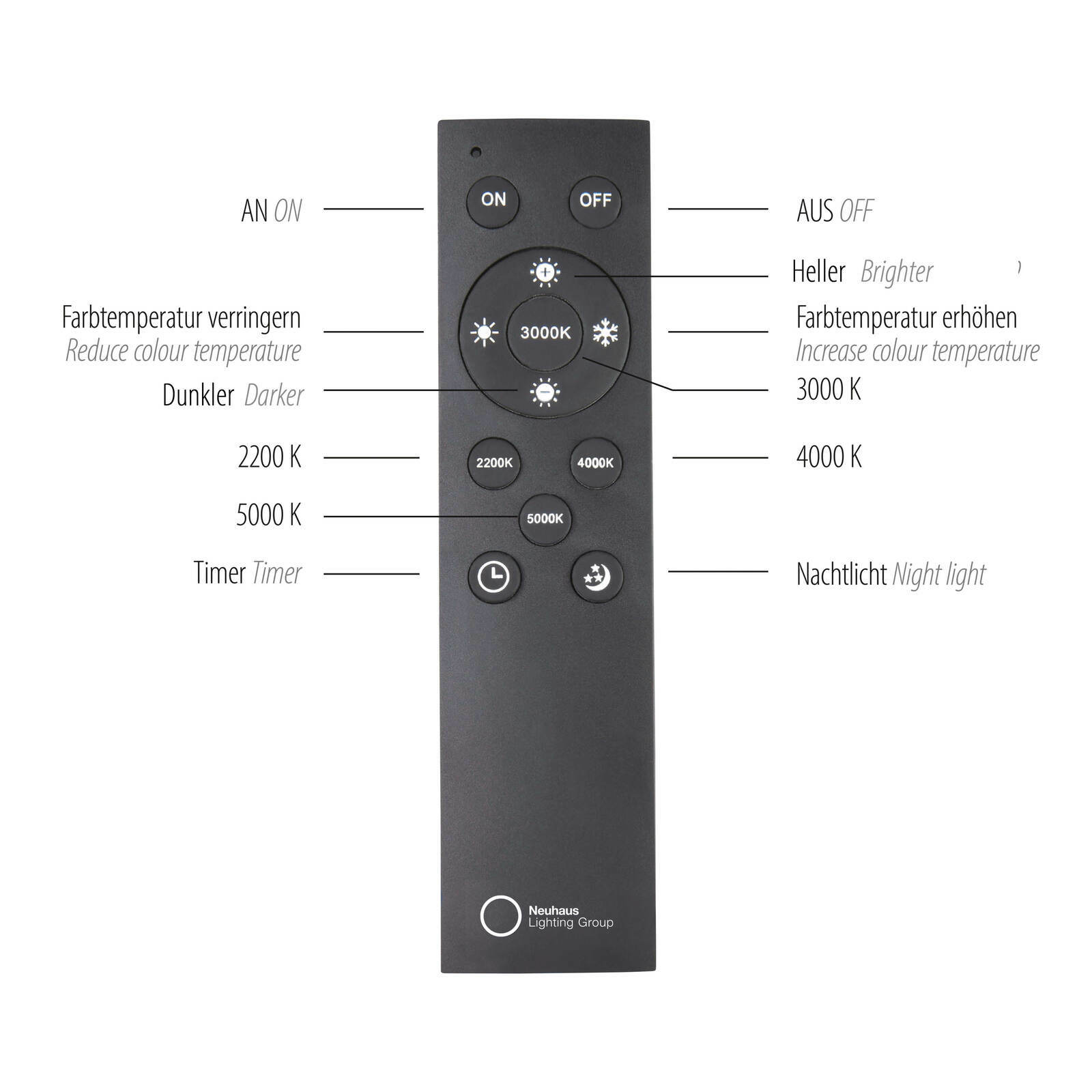 Neuhaus Pure LED-Deckenleuchte mit Fernbedienung Die PURE LINES ROUND Deckenleuchte ist nicht nur ein optisches Highlight, sondern auch technisch auf dem neuesten Stand. Mit der enthaltenen Fernbedienung lässt sich die Helligkeit und Farbtemperatur einfach anpassen, um die perfekte Atmosphäre zu schaffen. Gefertigt aus hochwertigem Kunststoff, ist die Leuchte langlebig und pflegeleicht. Dank des Netzbetriebs entfällt das lästige Batteriewechseln, und die enthaltenen LED-Leuchtmittel sorgen für eine langanhaltende Lichtfreude. Erleben Sie die perfekte Symbiose aus Design und Funktionalität und kaufen Sie noch heute Ihre Neuhaus Pure LED-Deckenleuchte.