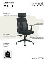Funktionaler DrehstuhlDas B/H/T ca. 62 x 122 x 61 cm große Modell (Gewicht 22,1 kg) passt in jedes Büro. Fünf gebremste Universalrollen (harte/weiche Böden) und das höhenverstellbare Drehgestell (Gaslift, Butterfly-Mechanismus) geben Ihnen Flexibilität. Bequemes Arbeiten ermöglicht die hochwertige Sitzschale (Sitzbreite 50 cm, Sitztiefe 78 cm, Maximalbelastung 140 kg) mit Kopfstütze und Funktionsarmlehnen (67-75 cm). Kaufen Sie sich den Novel Drehstuhl "MALU"!