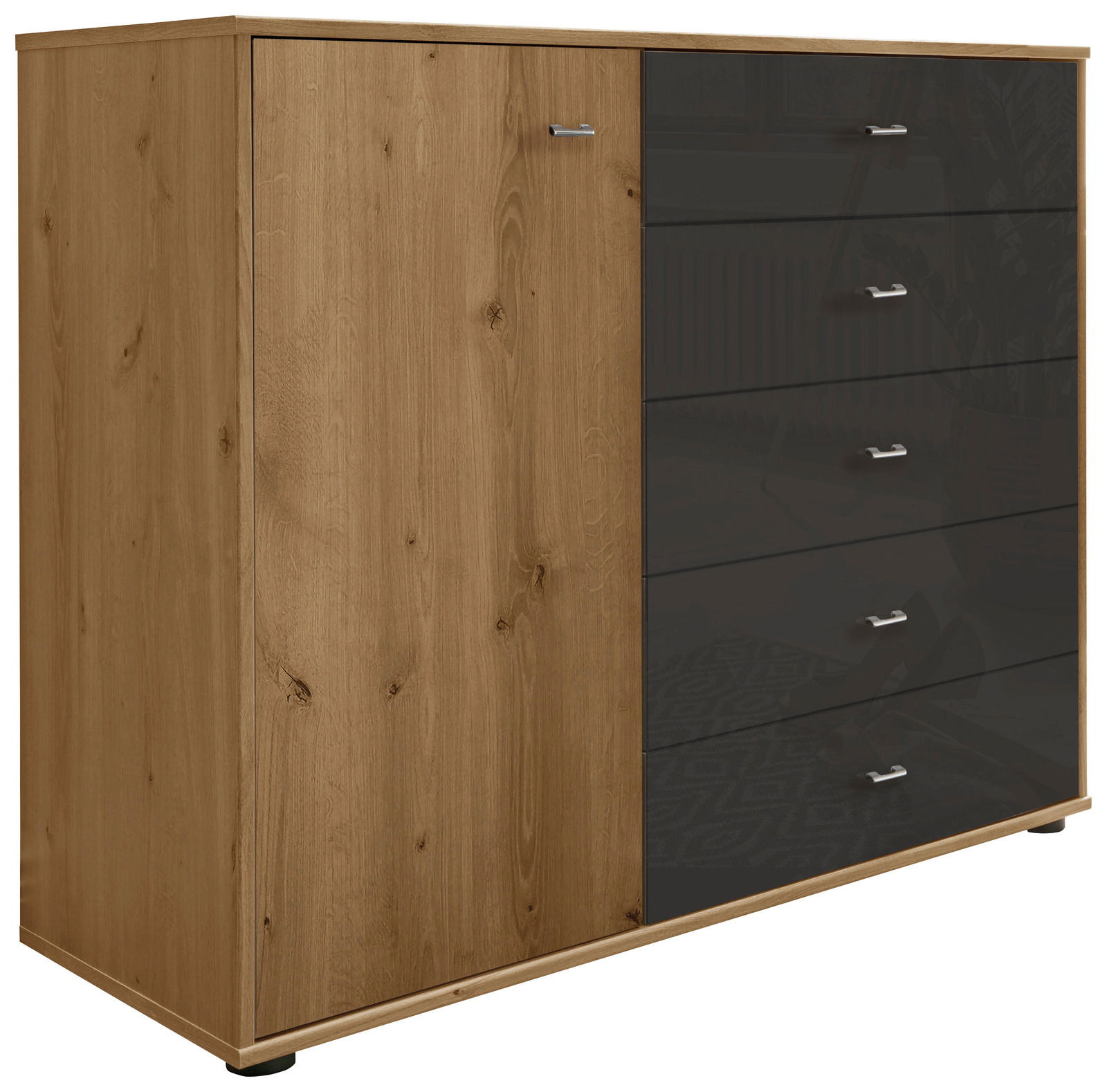 Die Kombikommode Sevilla von Novel vereint traditionelle Eleganz mit praktischer Funktionalität. Mit ihrem stilvollen Design in Eiche bianco und einem kontrastierenden schwarzen Fuß verleiht sie jedem Raum eine warme und einladende Atmosphäre. Die Kommode verfügt über eine Drehtür und fünf geräumige Schubladen, die ausreichend Stauraum für Kleidung, Accessoires oder Haushaltsgegenstände bieten. Die Griffe fügen sich harmonisch in das Gesamtbild ein und sorgen für eine einfache Handhabung. Gefertigt aus hochwertiger Holznachbildung und robustem Kunststoff, ist die Kombikommode nicht nur ästhetisch ansprechend, sondern auch langlebig und pflegeleicht. Entdecken Sie die zeitlose Schönheit der Sevilla-Kombikommode in Ihrem Zuhause.