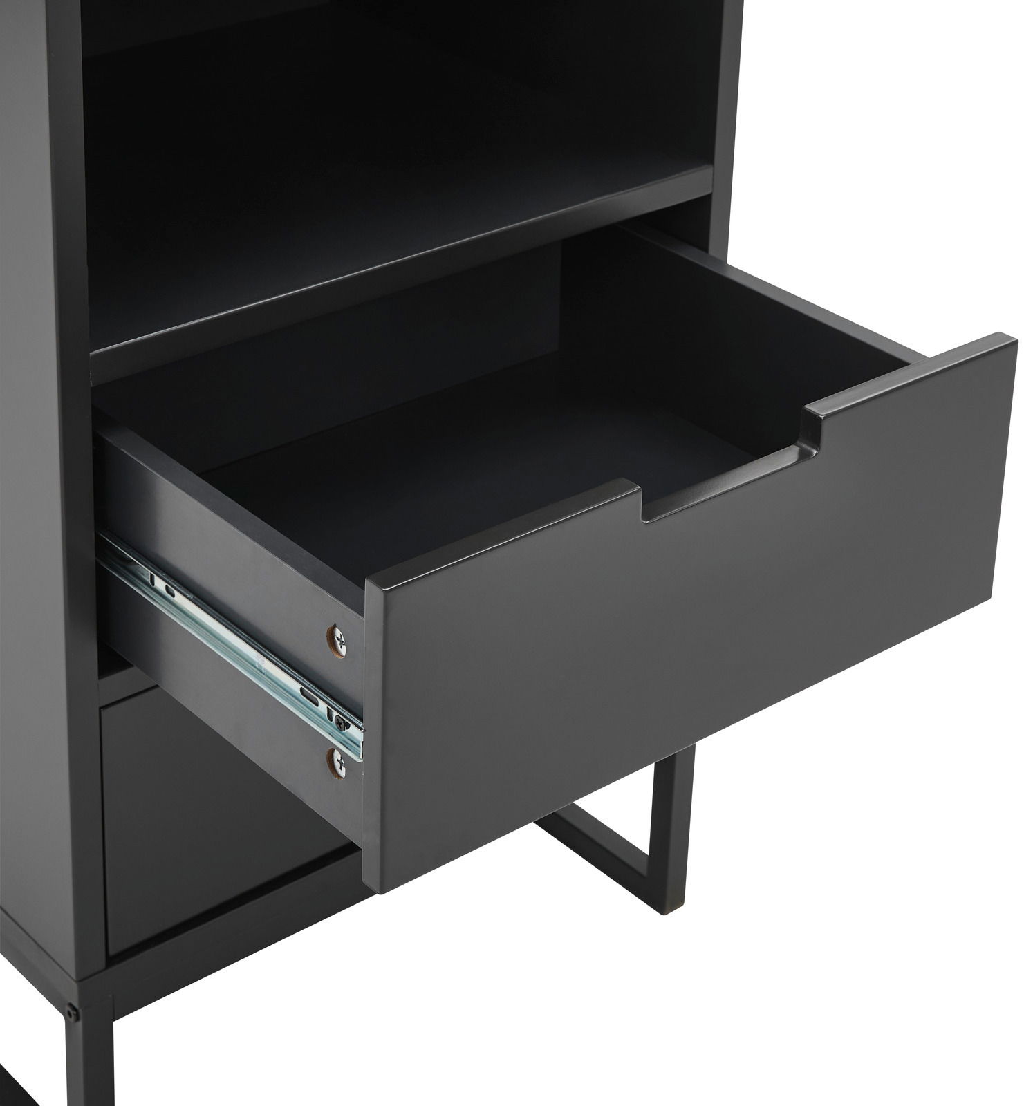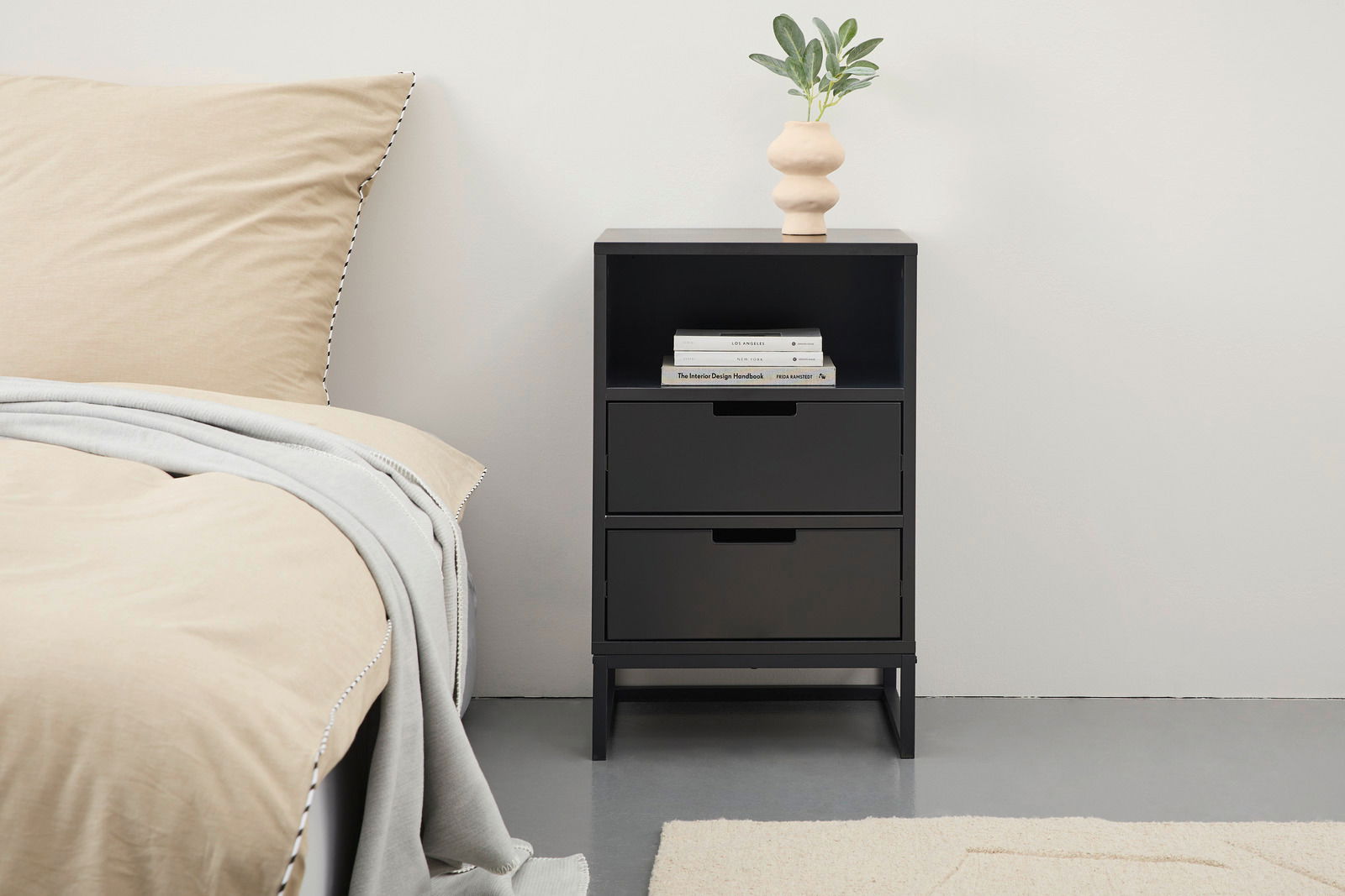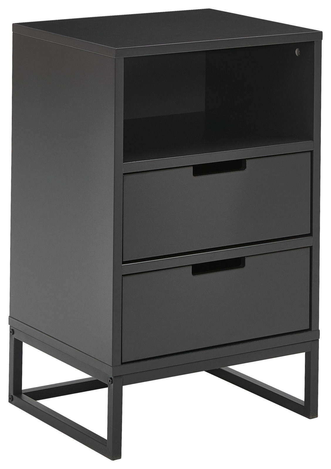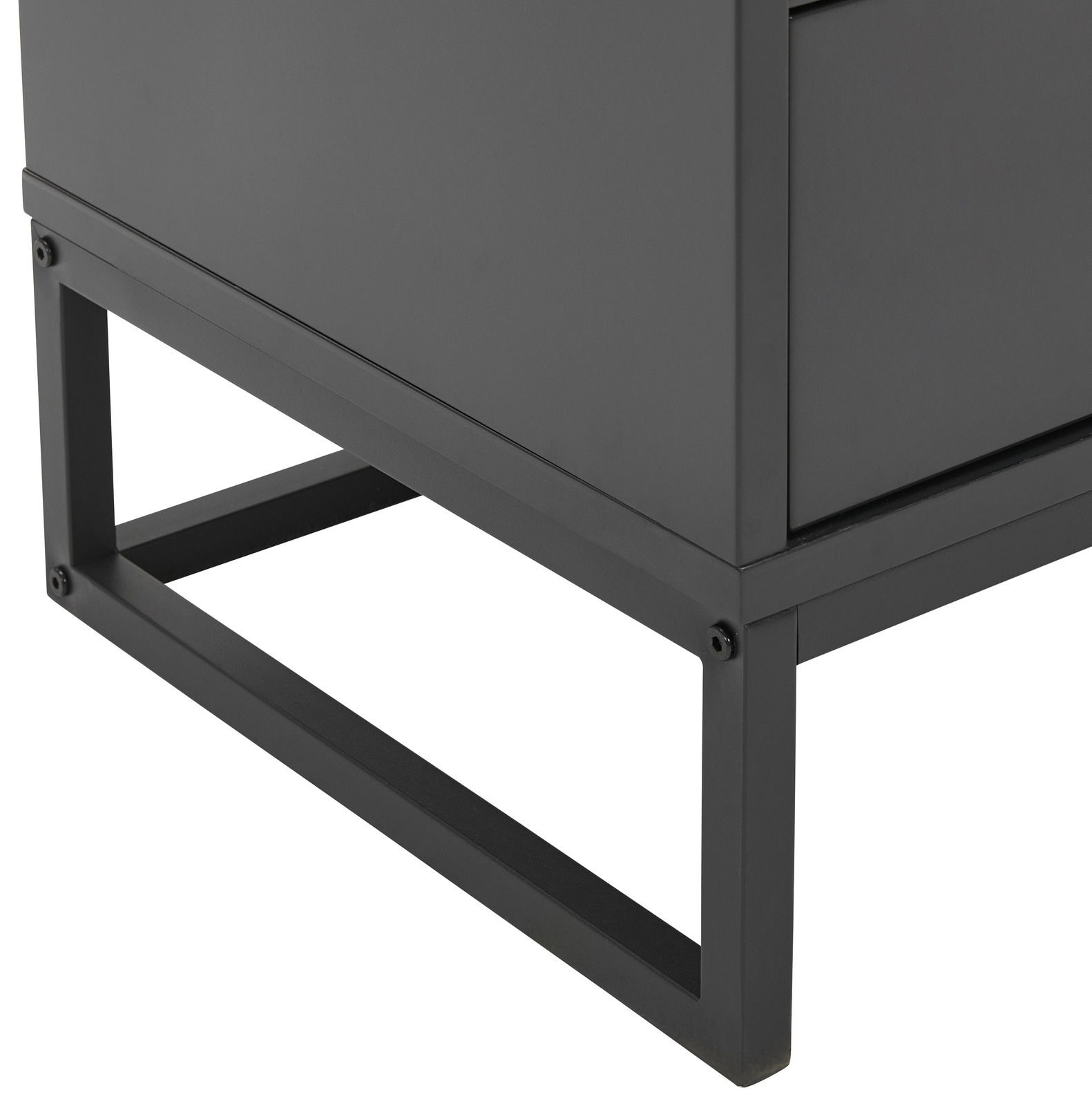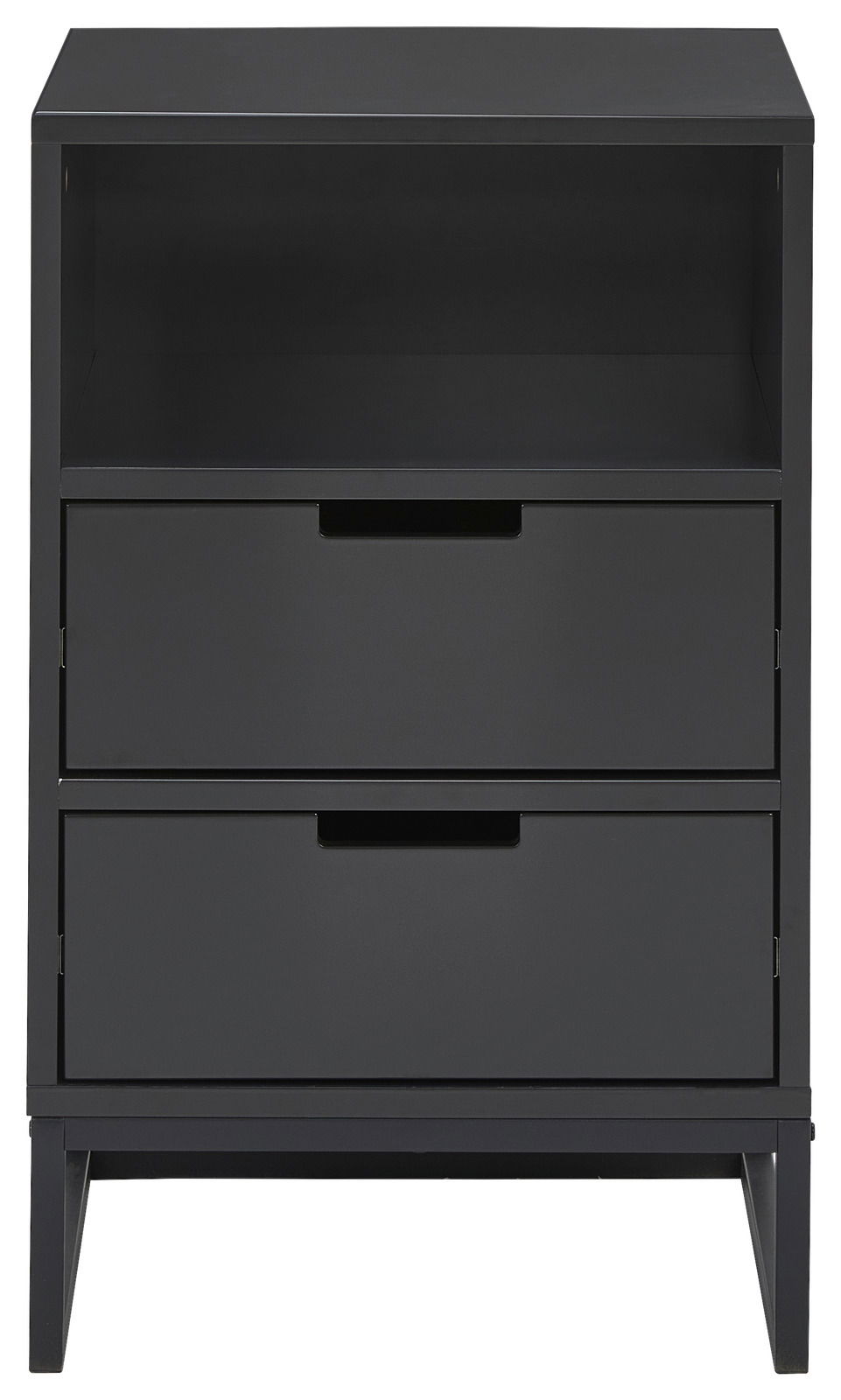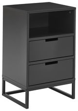 Die Novel Nachtkonsole hoch KUNO ist die perfekte Ergänzung für jedes moderne Schlafzimmer. Mit ihrem stilvollen Design, das sich durch den grauen Korpus und die graue Front in matt auszeichnet, fügt sie sich nahtlos in aktuelle Einrichtungstrends ein. Die robuste Konstruktion aus MDF und das pulverbeschichtete Metallgestell in Schwarz verleihen der Nachtkonsole nicht nur Stabilität, sondern auch eine edle Optik. Die zwei Schubladen bieten ausreichend Stauraum, um persönliche Gegenstände griffbereit zu halten, während die schwarzen Griffe einen eleganten Kontrast zur grauen Oberfläche bilden. Diese Nachtkonsole vereint Design und Funktion auf höchstem Niveau.