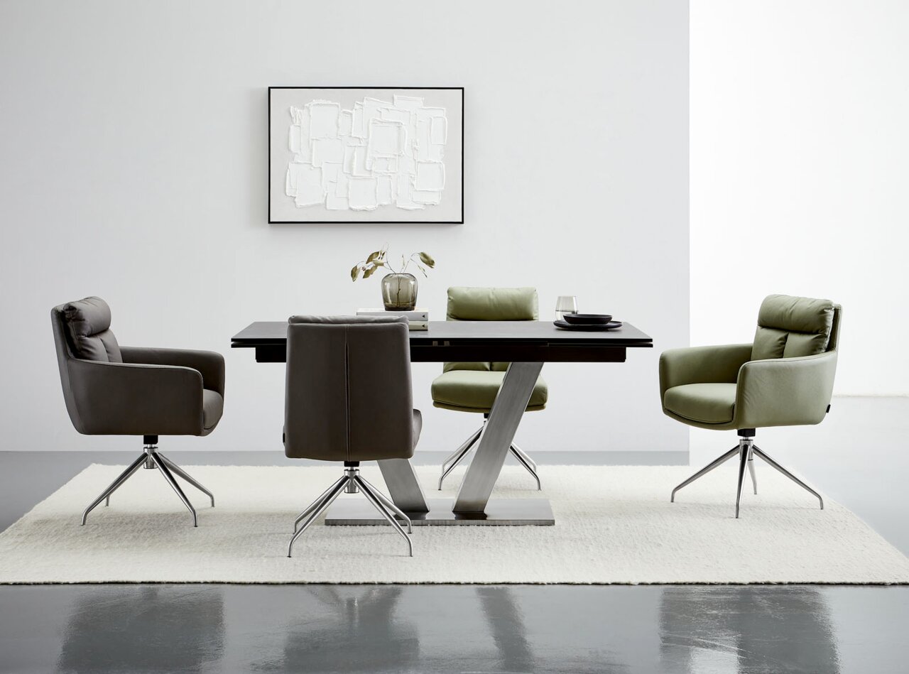 Der Novel Stuhl EMMA ist die perfekte Kombination aus modernem Design und hohem Komfort. Mit seinem stilvollen Bezug aus Stoff Vega in einem frischen Grünton verleiht dieser Stuhl jedem Raum einen zeitgemäßen Touch. Das gebürstete Metallgestell aus Edelstahl sorgt für eine robuste Konstruktion und unterstreicht den eleganten Look. Die Drehbarkeit des Stuhls steigert den Komfort und die Flexibilität im Alltag. Eine angenehme Sitzhöhe von 50,5 cm und eine Sitztiefe von 43,5 cm machen den Stuhl besonders bequem. Dank der hochwertigen Mikrofasern mit einer Strapazierfähigkeit von 20.000 Scheuertouren bleibt der Stuhl lange schön und pflegeleicht.