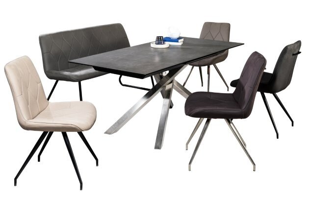 Durch den taupefarbenen Mikrofaserstoffbezug lässt sich der Novel Stuhl "HENRY" in jedes Farbklima modern eingerichteter Wohnräume integrieren. Dabei strahlt die großflächige Rautensteppung Gemütlichkeit aus, während das mattschwarze Vierfußgestell aus pulverbeschichtetem Metall einen eleganten Kontrast bildet.