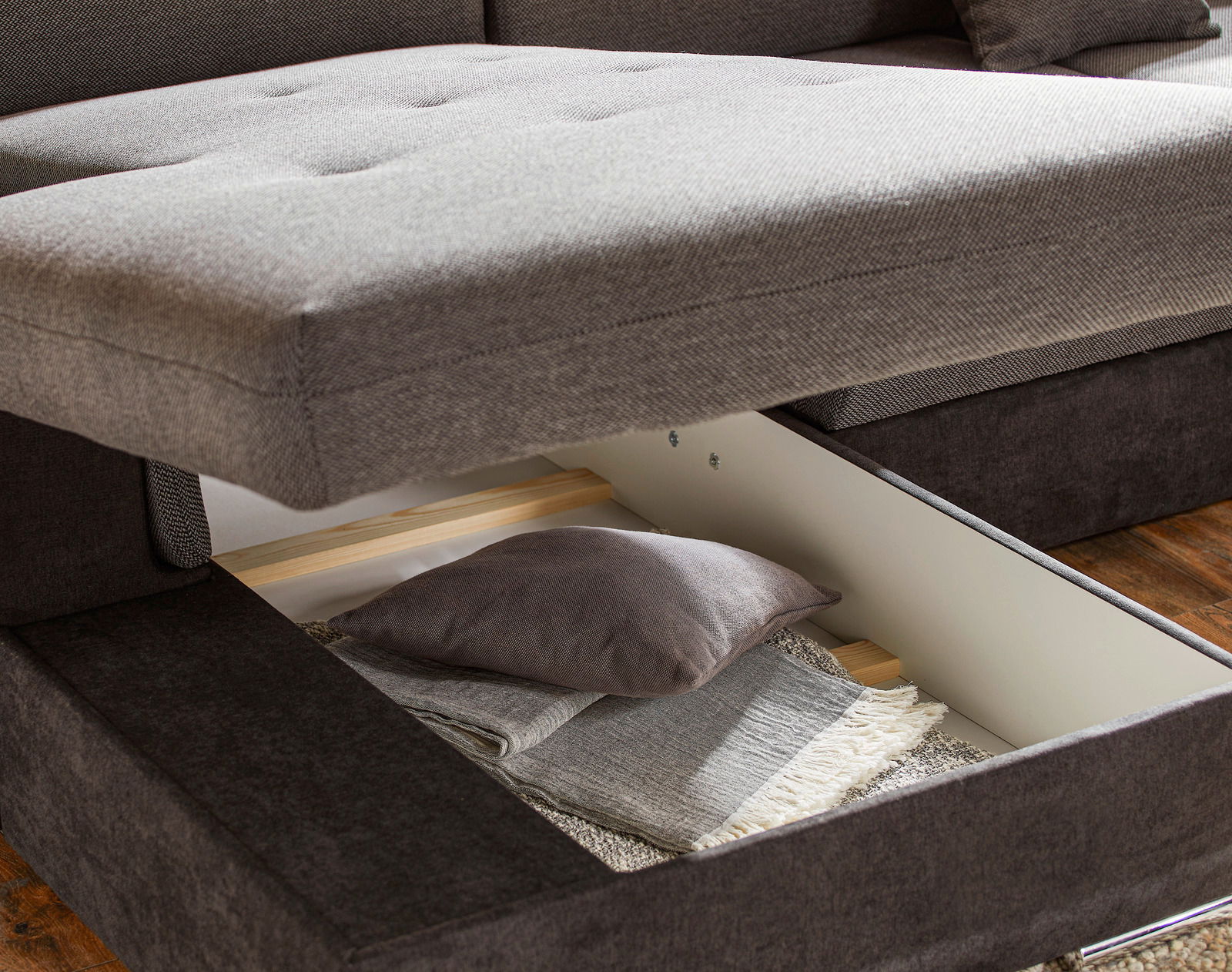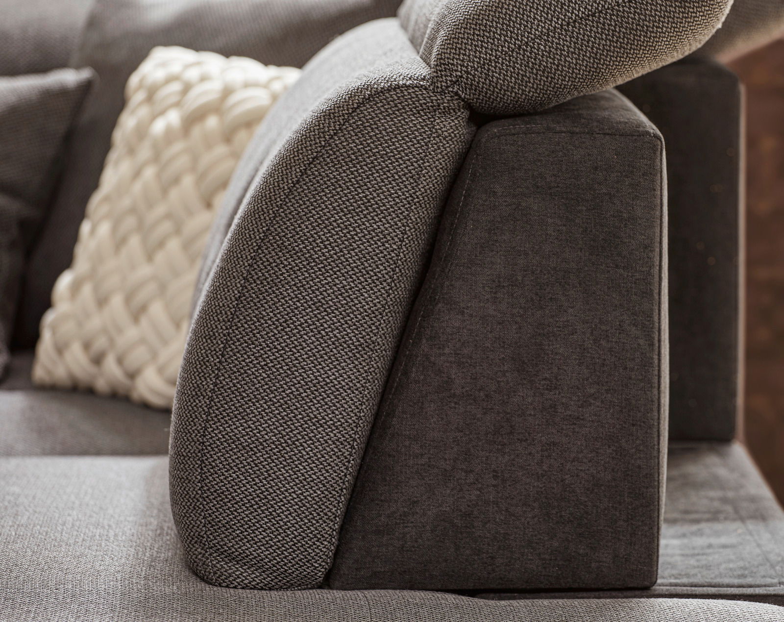 Die Osca Wohnlandschaft "BARCELONA" bietet ein ruhiges Erscheinungsbild zum modernen Wohngeschmack. Designstarke Akzente setzen die anthrazitfarbene durchgehende Stoffgestaltung im Hell-dunkel-Kontrast sowie silberfarbige Standfüße.