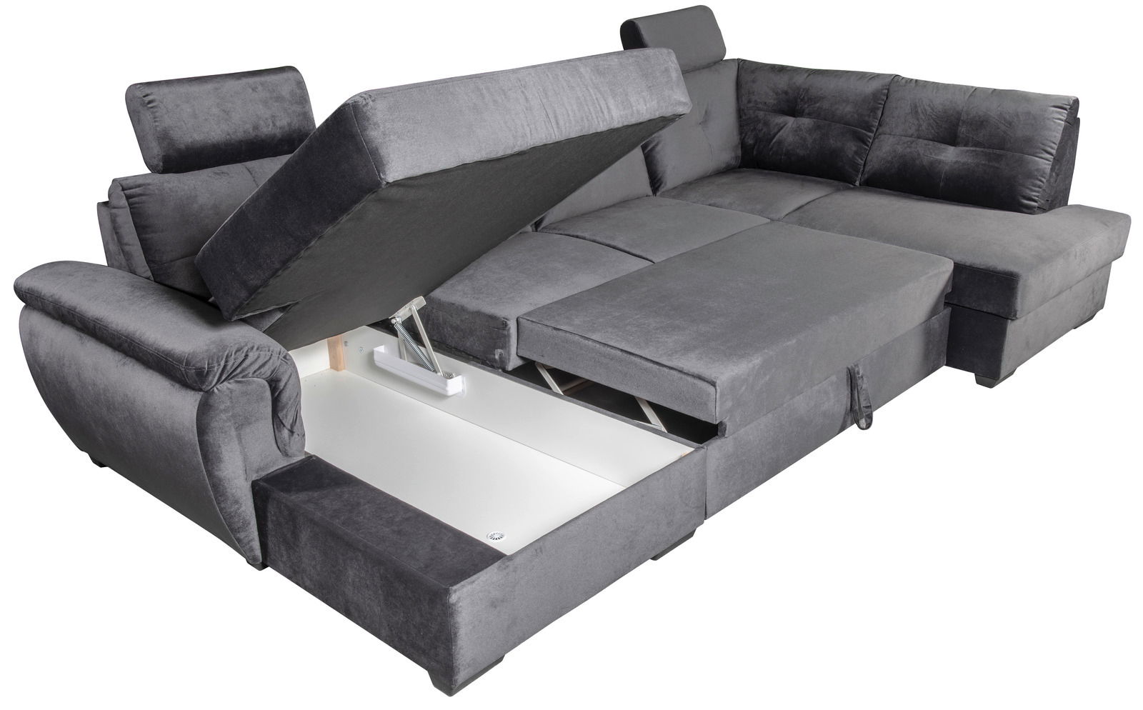 Das Schenkelmaß SCU ca. 168 x 325 x 184 cm (Gewicht 175 kg) ergänzt mittelgroße Räumlichkeiten. Sie erhalten eine Ottomane (links) inklusive Bettkasten, einen 2-Sitzer rechts mit Schlaffunktion (Liegefläche 120 x 255 cm) sowie zwei Kopfstützen (universal montierbar). Die Wellenunterfederung und Schaumausstattung dient Ihrem Komfort. Gönnen Sie sich noch heute die Osca Wohnlandschaft "MONTREAL"!