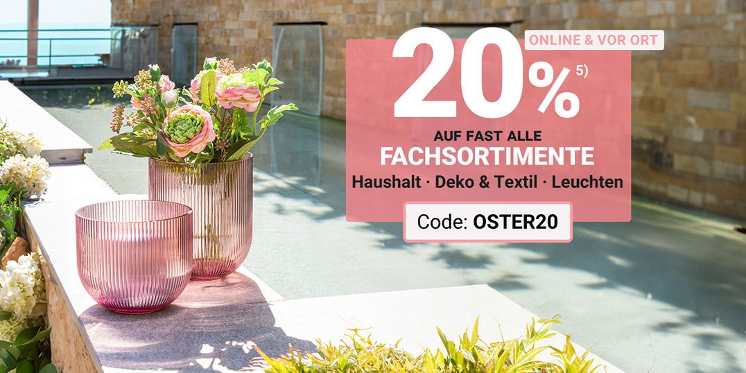 Sparen Sie 20 % auf fast alle Fachsortimente aus unseren Boutique-Fachmärkten mit dem Rabattcode OSTER20 oder besuchen Sie unsere Zurbrüggen-Wohnzentren und sparen Sie bei Ihrem nächsten Einkauf.