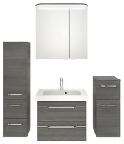 Erleben Sie das moderne Design und die trendige Ästhetik des Pelipal Badblocks BALTO SPRINT, der in einem eleganten Graphitton erhältlich ist. Der gesamte Block, einschließlich Front und Korpus, ist in dieser stilvollen Farbe gehalten, die Ihrem Badezimmer ein zeitgemäßes und ansprechendes Aussehen verleiht. Die Griffe sorgen für eine einfache Handhabung, während die Holznachbildung als Hauptmaterial für Langlebigkeit und ein hochwertiges Erscheinungsbild sorgt. Der Badblock ist mit einer Softclose-Funktion ausgestattet, die sanftes Schließen der Türen ermöglicht. Die integrierte Beleuchtung mit nicht austauschbaren LED-Leuchtmitteln bietet eine angenehme Helligkeit und ein modernes Ambiente.