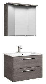 Mit strukturiertem Graphitdekor bringt der Pelipal Badblock "TRENTINO" moderne Behaglichkeit ins Badezimmer. Ein einfach verspiegelter Spiegelschrank und chromfarbene Bügelgriffe erweitern seine puristische Optik.