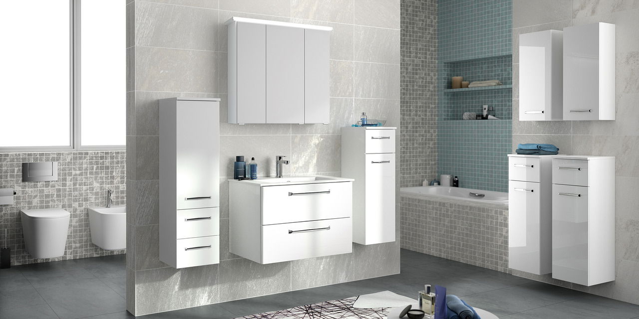 Badezimmerfliesen aller Art harmonieren mit dem Pelipal Badblock "TRENTINO" vorzüglich. Seine weiße Gestaltung wird mit Chromgriffen in Hochglanz edel vervollständigt. Der beleuchtbare Spiegelschrank wirkt dezent.