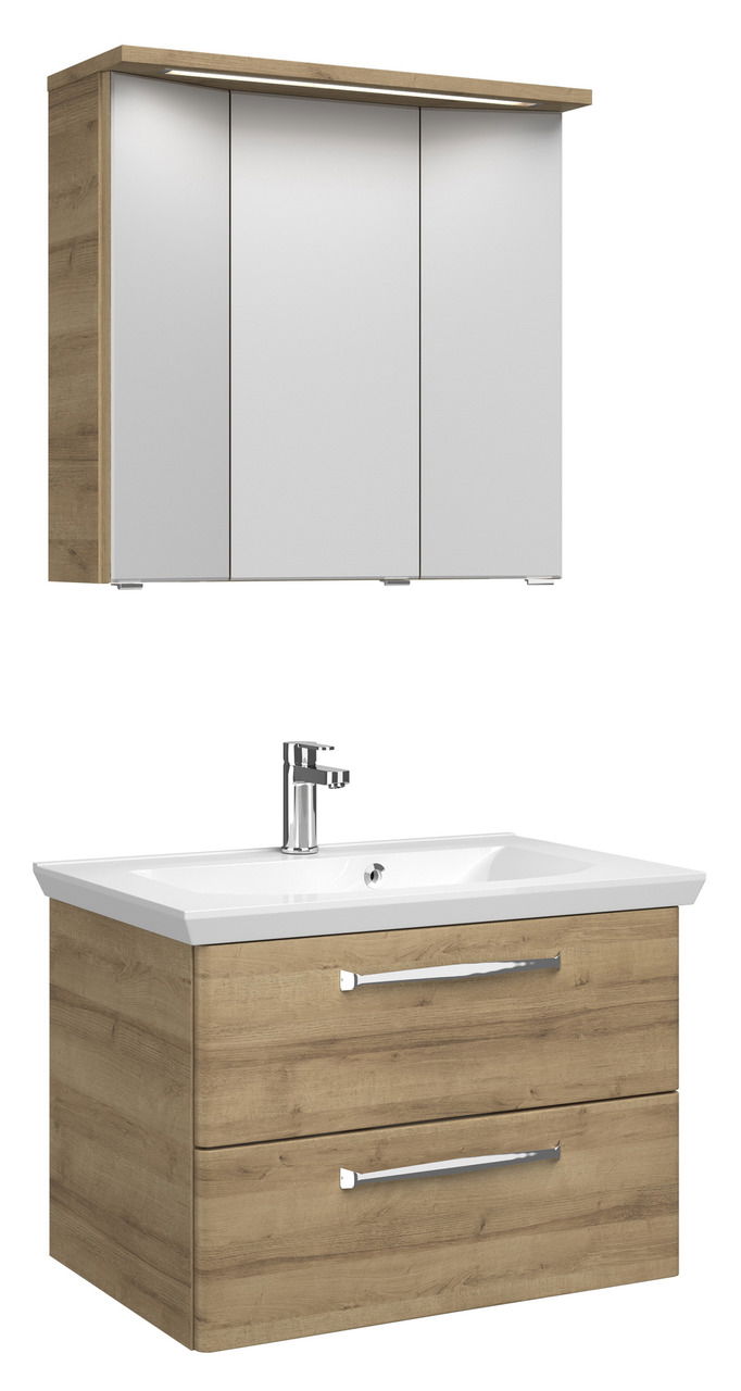 Mit dem Pelipal Badblock "TRENTINO" bekommt Ihr Bad ein modernes Landhauselement. Durch den geradlinigen Korpus im Eichendekor mit Chrom-Bügelgriffen bleibt die Ausführung dem klassischen Stil treu. Der Spiegelschrank greift das Design auf und verleiht in Verbindung mit dem weißen Einzelwaschbecken der Einheit ein harmonisches Finish.