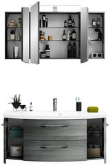 Die Pelipal Badkombination CASSCA SPRINT vereint modernes Design mit funktionaler Eleganz. In einem stilvollen Graphit gehalten, setzt diese Kombination in jedem Badezimmer einen trendigen Akzent. Die Front und der Korpus aus Holznachbildung verleihen dem Möbelstück eine hochwertige Optik. Ausgestattet mit zwei Drehtüren und zwei Schubladen, bietet die Kombination ausreichend Stauraum für all Ihre Badutensilien. Die Softclose-Funktion garantiert ein sanftes Schließen der Türen und Schubladen, während die integrierte LED-Beleuchtung mit einer Nennleistung von 8 W für das perfekte Ambiente sorgt. Die hängende Aufstellung verleiht dem Raum eine luftige Leichtigkeit.