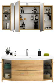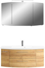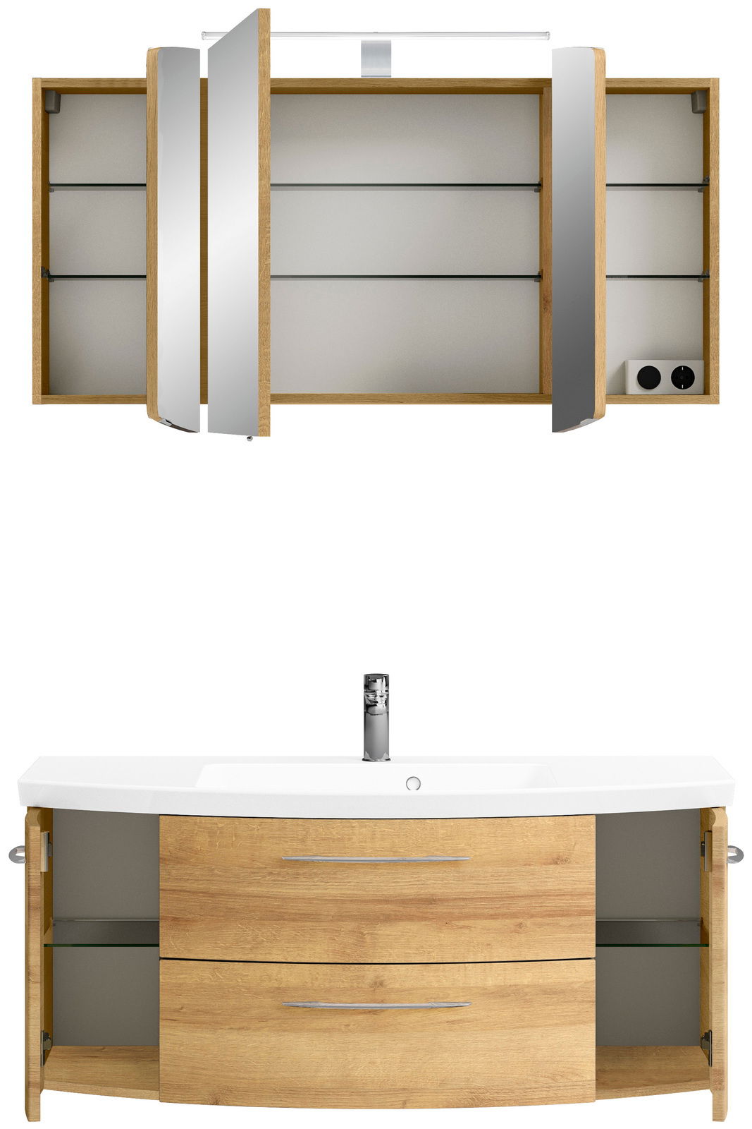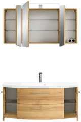 Die Pelipal Badkombination CASSCA SPRINT ist die ideale Wahl für alle, die auf der Suche nach moderner Eleganz und Funktionalität im Badezimmer sind. In der Farbe Riviera Eiche gehalten, fügt sich diese Kombination nahtlos in jedes moderne Wohnambiente ein. Aus Holznachbildung gefertigt, bietet sie nicht nur ein ansprechendes Design, sondern auch langlebige Qualität. Die zwei Drehtüren und zwei Schubladen mit Softclose-Funktion ermöglichen eine sanfte und leise Handhabung. Mit einer integrierten LED-Beleuchtung, die eine Nennleistung von 8 W aufweist, sorgt sie für ein perfekt ausgeleuchtetes Badezimmererlebnis und schafft gleichzeitig eine angenehme Atmosphäre.