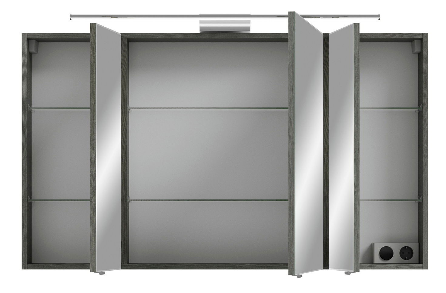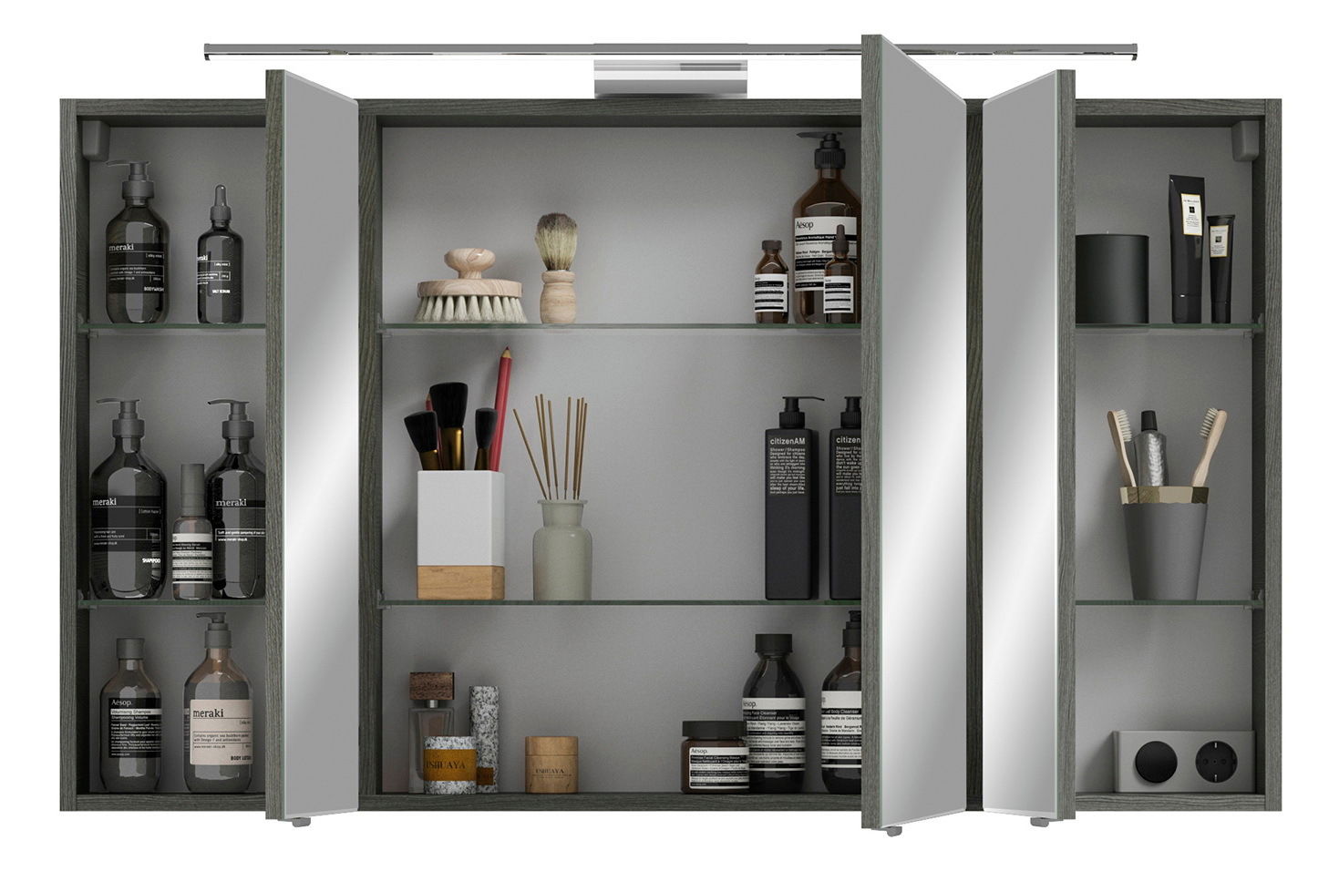 Der Pelipal Spiegelschrank SERIE 6005 SPRINT vereint modernes Design mit praktischer Funktionalität und ist das perfekte Highlight für jedes Badezimmer. Der Korpus in stilvollem Graphit strahlt eine zeitlose Eleganz aus, die sich nahtlos in Ihr Interieur einfügt. Ausgestattet mit drei Drehtüren, bietet der Spiegelschrank großzügigen Stauraum für all Ihre Badeutensilien. Das hochwertige Material in Holznachbildung sorgt für eine ansprechende Optik und langlebige Qualität. Die integrierte LED-Beleuchtung mit einer Nennleistung von 10 W sorgt für ein angenehmes und effizientes Licht, das ideal für die tägliche Pflege ist.