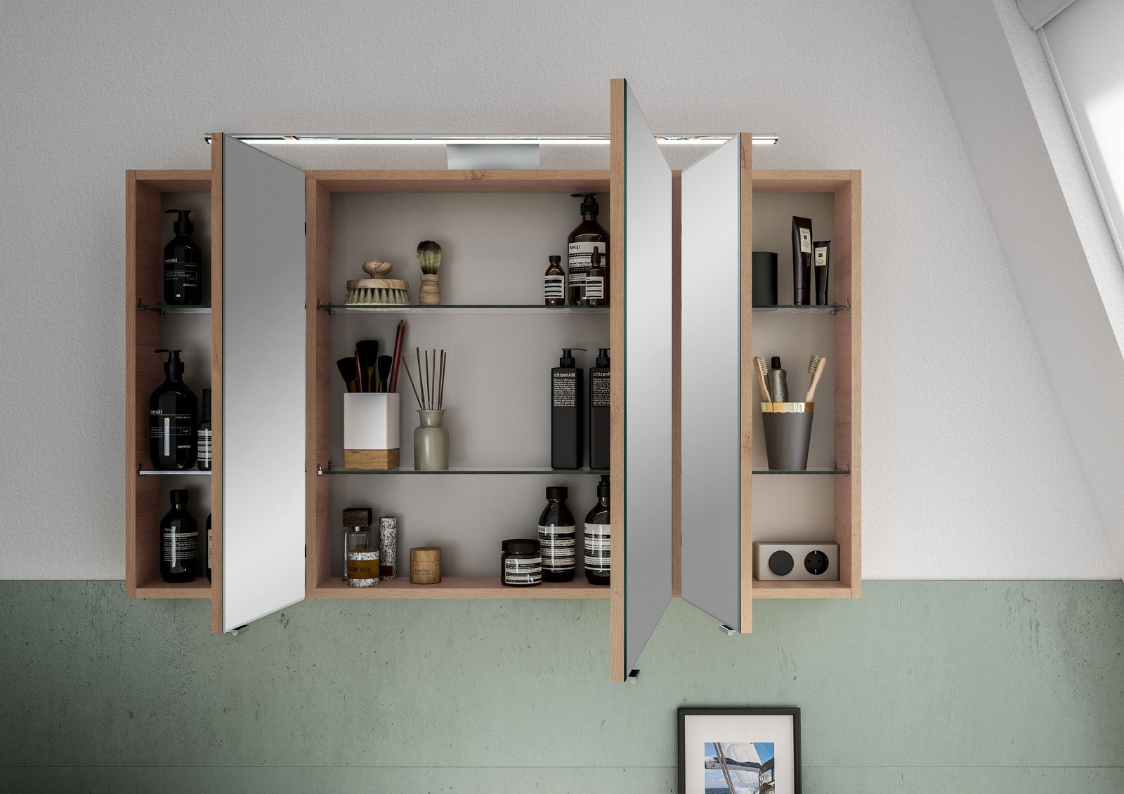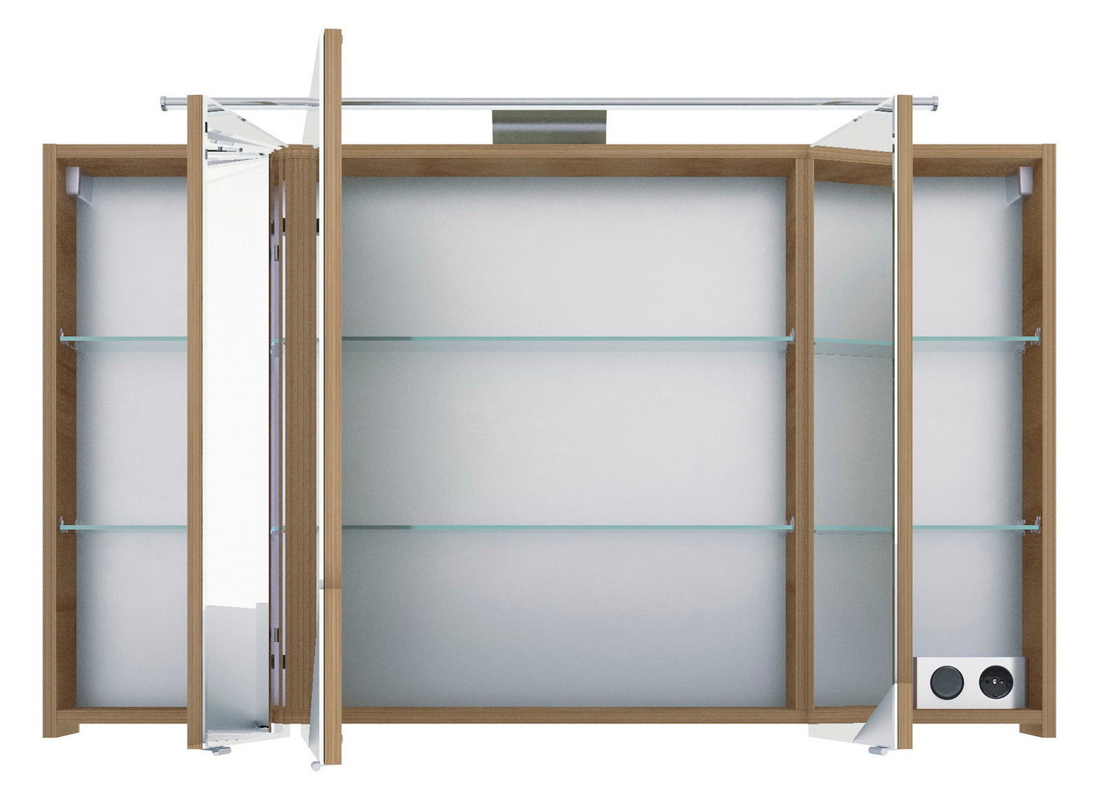 Der Pelipal Spiegelschrank SPRINT vereint moderne Eleganz mit funktionalem Design und wird so zum Highlight in jedem Badezimmer. Der Korpus und die Hauptfarbe in Riviera Eiche sorgen für eine natürliche und warme Ausstrahlung, die sich harmonisch in verschiedenste Einrichtungsstile einfügt. Ausgestattet mit drei Drehtüren, bietet dieser Spiegelschrank ausreichend Platz für all Ihre Pflegeprodukte. Das Hauptmaterial aus hochwertiger Holznachbildung garantiert Langlebigkeit und Robustheit. Die integrierte LED-Beleuchtung mit einer Nennleistung von 10 W sorgt für eine optimale Ausleuchtung und schafft eine angenehme Atmosphäre. Die LED-Leuchtmittel sind im Lieferumfang enthalten, sodass der Schrank sofort einsatzbereit ist.