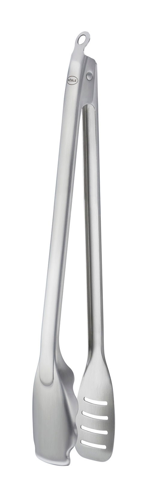 Die Rösle Premium Grillzange "BBQ" gehört zur perfekten Grillausstattung. Mit dem silbernen Edelstahlgerät platzieren und wenden Sie Grillgut sicher. Das L ca. 44 cm Zangenmaß (0,34 kg) liegt gut in der Hand und weist eine praktische Öse zum Aufhängen auf.