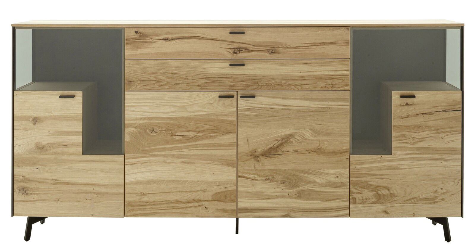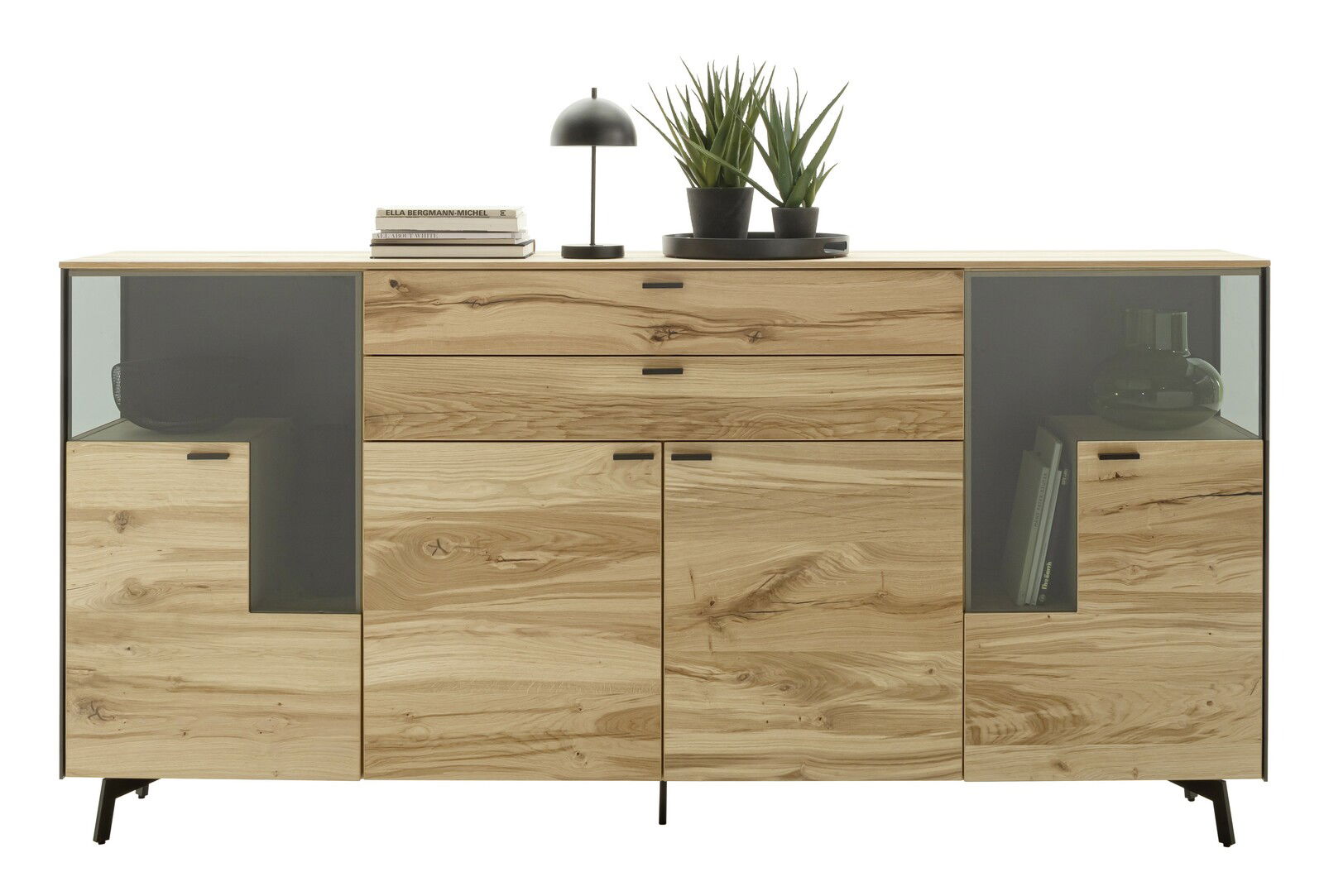 Das Schöner Wohnen Sideboard ANDRA beeindruckt durch sein modernes Design und den trendigen Stil. Gefertigt aus hochwertigem Eiche rustico hell furniertem Holz, bringt es natürliche Eleganz in Ihr Zuhause. Die Fronten und der Korpus sind in eichenfarben gehalten, während die Rückwand in einem edlen Anthrazit matt gestaltet ist. Ausgestattet mit vier Drehtüren und zwei praktischen Schubladen, bietet dieses Sideboard ausreichend Stauraum für Ihre Wohnutensilien. Die integrierte Beleuchtung setzt das Möbelstück perfekt in Szene und sorgt für eine angenehme Atmosphäre.