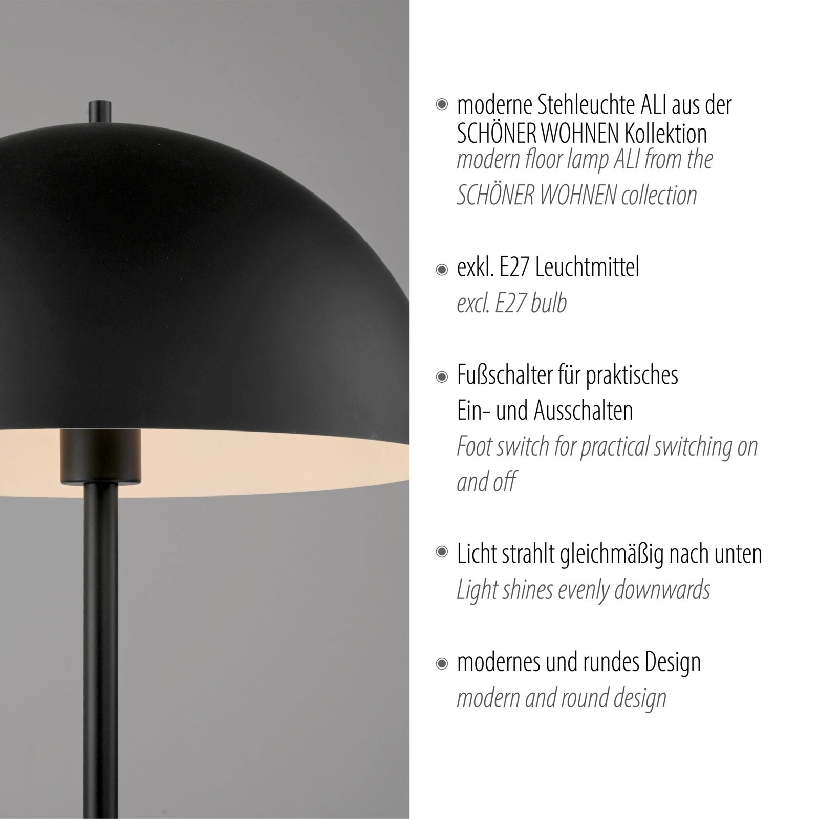 Schöner Wohnen Stehleuchte ALI - Modernes Design Mit der Schöner Wohnen Stehleuchte ALI setzen Sie stilvolle Akzente in Ihrem Zuhause. Das moderne Design und die hochwertige Verarbeitung machen sie zu einem echten Blickfang. Betrieben über Netzbetrieb, sorgt die Leuchte für eine gleichmäßige und angenehme Ausleuchtung Ihrer Räume. Die Möglichkeit, das Leuchtmittel zu wechseln, bietet Ihnen die Freiheit, die Lichtstimmung nach Ihren Wünschen zu gestalten. Die einfache Handhabung und Pflege machen diese Stehleuchte zu einem unverzichtbaren Einrichtungsgegenstand. Überzeugen Sie sich selbst von der Qualität und bestellen Sie jetzt die Schöner Wohnen Stehleuchte ALI!