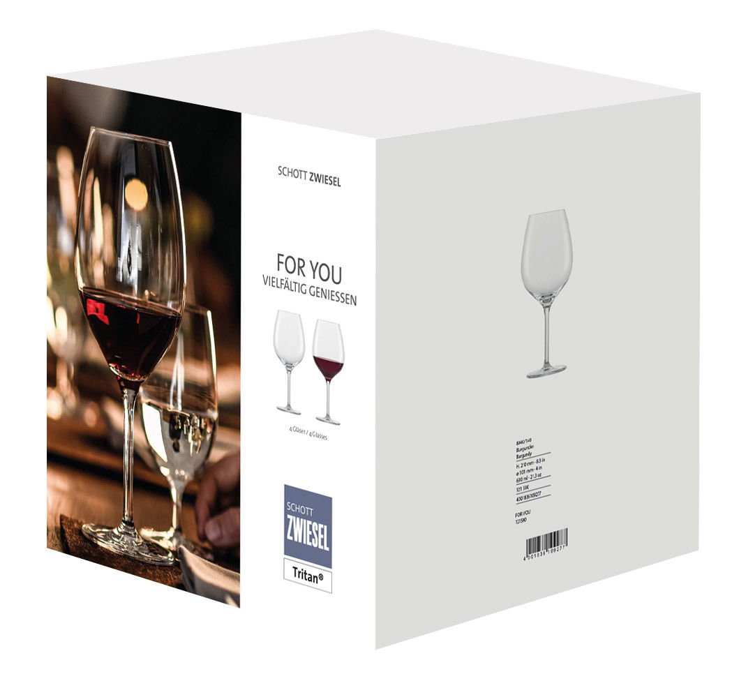 Zum stilsichen Tafelambiente nutzen Sie das Schott Zwiesel Rotweinglas-Set 4-tlg. "FOR YOU". Sein bauchiges Kristallglasdesign besitzt puristische Eleganz und entfaltet sensible Weinaromen. Das hochwertige Set (D/H ca. 10,1 x 21 cm, 0,21 kg) umfasst vier spülmaschinenfeste Gläser. Made in Germany.