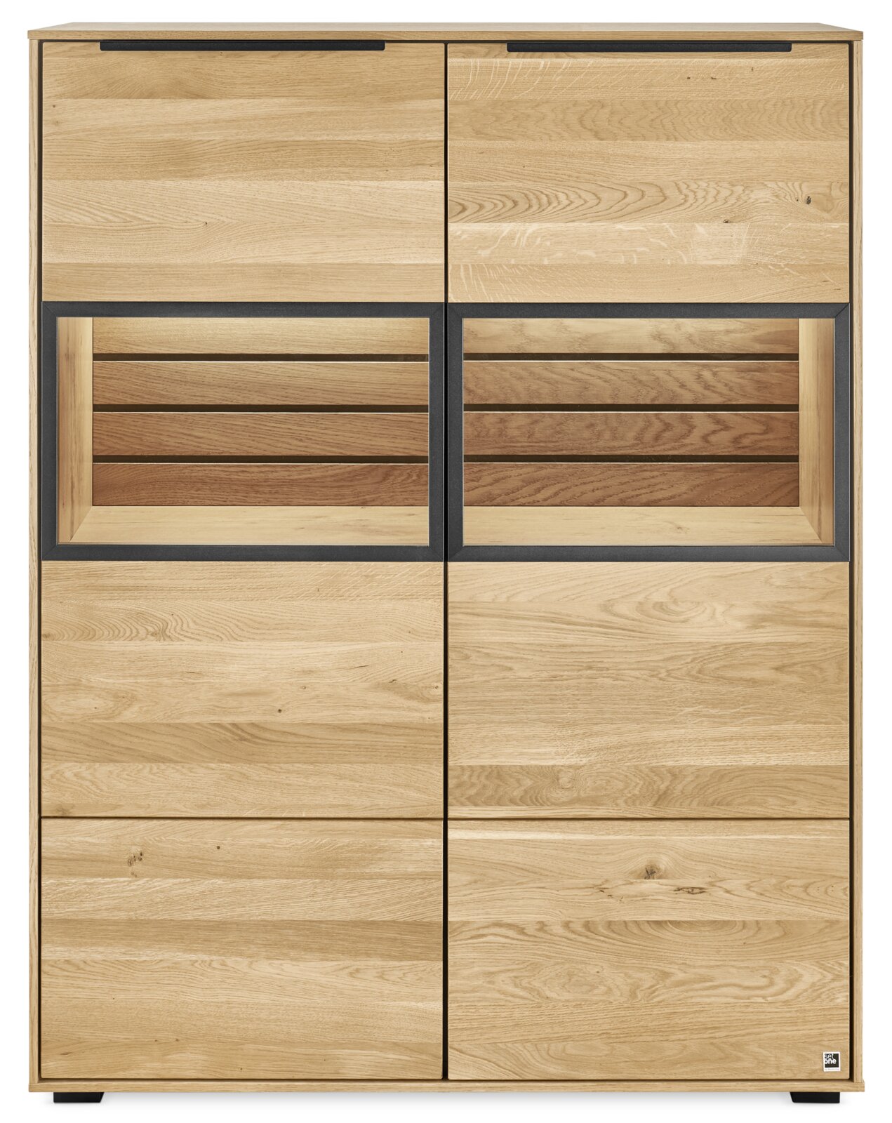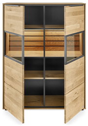 Highboard SET ONE JACKSON – Stilvolles Design trifft Funktionalität Das Highboard überzeugt nicht nur durch seine ästhetische Erscheinung, sondern auch durch die hohe Funktionalität. Dank der beiden Drehtüren können Sie Ihre Wohnaccessoires, Bücher oder Geschirr stilvoll und sicher verstauen. Die graphitgetönte Glasfront sorgt für einen modernen Akzent und schützt gleichzeitig den Inhalt vor Staub. Die Verwendung von teilmassivem Eichenholz steht für Langlebigkeit und Qualität. Ergänzen Sie Ihr Zuhause mit diesem einzigartigen Möbelstück und erleben Sie die perfekte Symbiose aus Design und Funktion. Entdecken Sie jetzt die Möglichkeiten dieses Highboards!