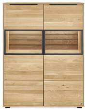 Das Highboard SET ONE JACKSON von Set one by Musterring vereint modernes Design mit natürlichem Charme. Die Kombination aus massivem Eichenholz und einer graphitgetönten Glasfront verleiht dem Möbelstück einen eleganten und zeitlosen Look. Die Fronten aus geöltem, teilmassivem Eichenholz und der furnierte Korpus sorgen für eine harmonische Optik, die sich perfekt in verschiedene Wohnstile einfügt. Die sichtbaren Rückwände aus massivem Eichenholz unterstreichen die hochwertige Verarbeitung. Zwei Drehtüren mit stilvollen Griffen bieten Platz für Ihre Lieblingsstücke und sorgen für eine organisierte Aufbewahrung in Ihrem Zuhause.