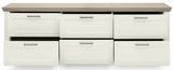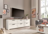 Sideboard SET ONE YORK – Stilvoller Stauraum Dieses Sideboard vereint Funktionalität mit ansprechender Ästhetik und ist die ideale Ergänzung für jedes Wohnzimmer im Landhausstil. Das elegante Weiß harmoniert perfekt mit verschiedenen Einrichtungsstilen und bringt Helligkeit und Frische in jeden Raum. Die sechs geräumigen Schubladen bieten ausreichend Platz, um Ordnung zu schaffen und Gegenstände übersichtlich zu verstauen. Die robuste Nachbildung von Holz sorgt für eine authentische Optik, die kaum von echtem Holz zu unterscheiden ist. Entscheiden Sie sich für dieses stilvolle Möbelstück und verleihen Sie Ihrem Zuhause einen Hauch von Landhauscharme. Entdecken Sie das Sideboard SET ONE YORK und erleben Sie die perfekte Kombination aus Design und Funktionalität.