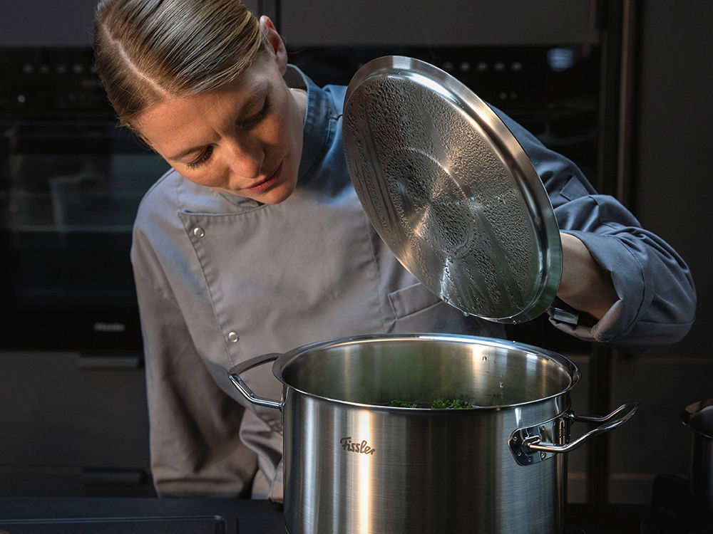 Fissler ist für diejenigen, die Kochen nicht als notwendige Aufgabe betrachten, sondern als Chance, ihr Können und ihre Kreativität auszuleben. Leidenschaftliche Köche, für die jeder Moment zählt: die Energie und Präzision beim Schneiden und Hacken, die geschmeidigen Bewegungen beim Rühren, die Freude, wenn sich die Aromen langsam entfalten. Und schließlich der Moment des Triumphs und der Zufriedenheit, wenn wieder einmal ein Gericht perfekt gelungen ist.