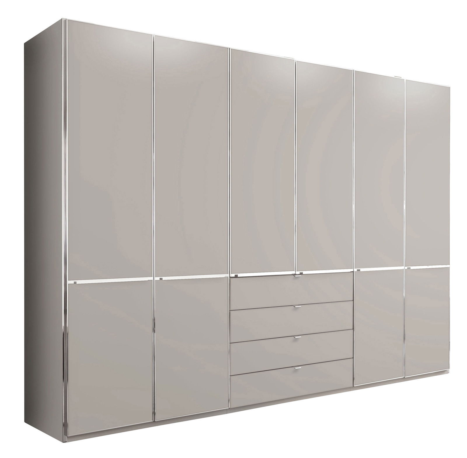 Bevorzugen Sie einen modernen Look, wählen Sie Kleiderschränke aus einem durchdachten Materialmix: Die Grundlage bilden MDF-Platten beispielsweise in schlichtem Grau-Anthrazit oder mit einer Hochglanzveredlung in Schwarz oder Weiß. Das Design wird mit Elementen aus leichtem Metall wie Chrom und Aluminium abgerundet, zum Beispiel mit einer langen chromglänzenden Griffleiste am eleganten Schwebetürenschrank.