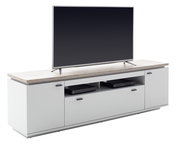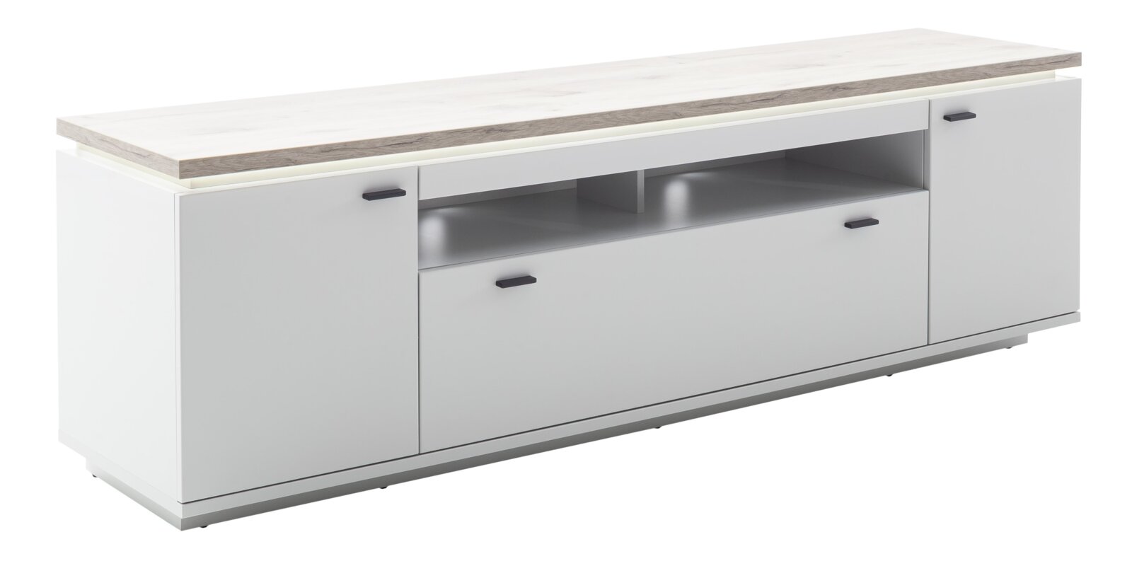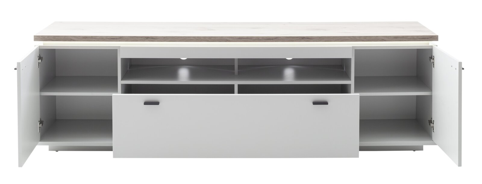 Entdecken Sie das Stylife TV-Lowboard ESTEPONA, das mit seinem modernen und trendigen Design Ihr Wohnzimmer aufwertet. In einem eleganten Weiß gehalten, fügt es sich nahtlos in jedes Interieur ein. Die Front und der Korpus präsentieren sich in reinem Weiß, während die dezente LED-Beleuchtung im Oberboden einen Hauch von Luxus verleiht. Mit zwei Drehtüren und einer praktischen Schublade bietet das Lowboard ausreichend Stauraum für all Ihre Mediengeräte und Zubehör. Gefertigt aus hochwertiger Holznachbildung, vereint es Stil mit Langlebigkeit. Die stilvollen Griffe ergänzen das elegante Gesamtbild perfekt.