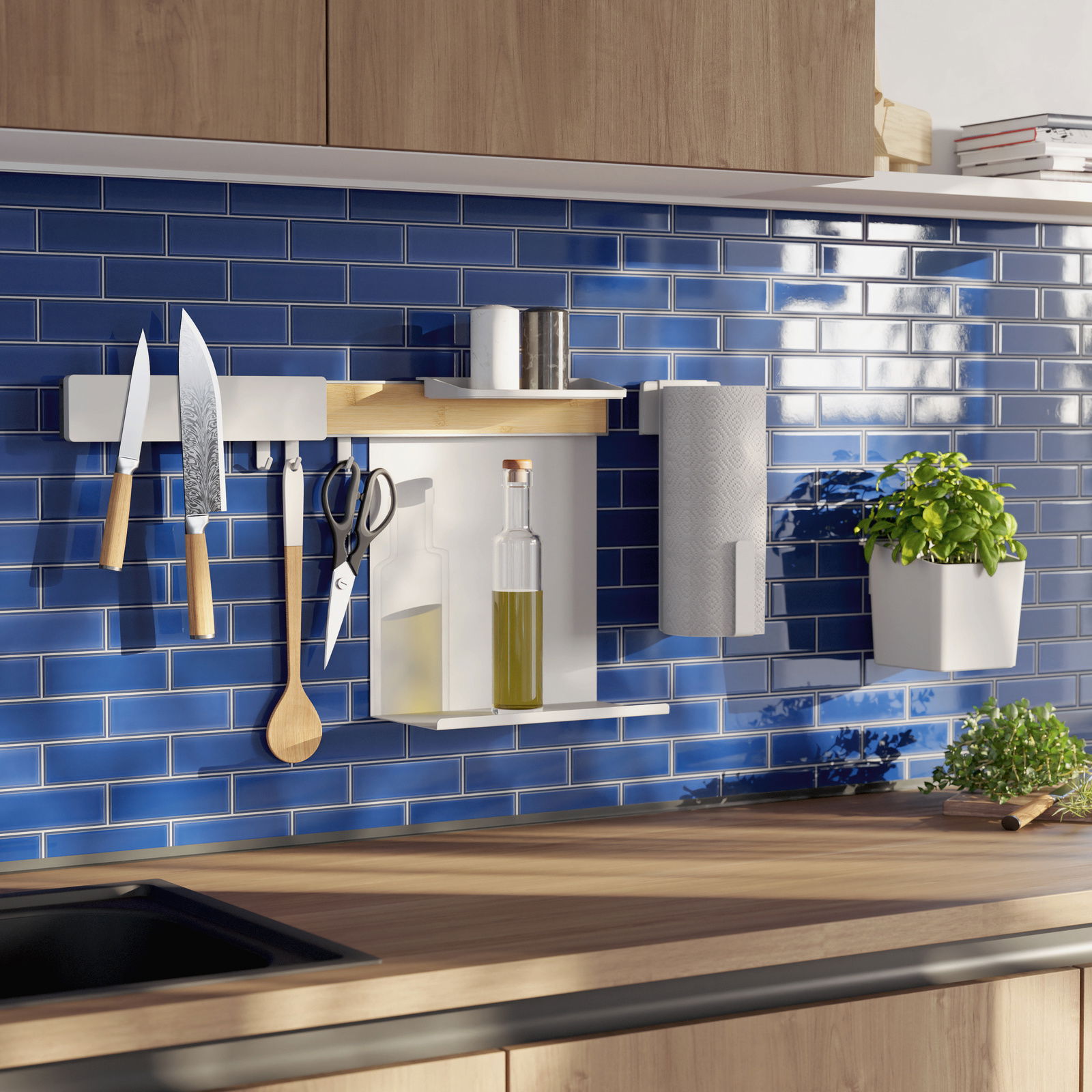Der Tesa Küchenorganizer Kombi-Set L KITCHEN ist der perfekte Begleiter für eine moderne und stilvolle Küche. Mit seiner eleganten weißen Farbgebung fügt er sich nahtlos in jedes Küchenambiente ein und bietet eine stilvolle Lösung für eine gut organisierte Küche. Das Set besteht aus hochwertigem Kunststoff und umfasst eine praktische Ablage, einen Kräutertopf, einen Gewürzhalter, einen Messerhalter und einen Rollenhalter. Durch das innovative Adapter- und Klebe-Powerkit ist die Anbringung des Organizers denkbar einfach, ohne dass Bohren oder Schrauben erforderlich sind. Erleben Sie eine neue Art der Küchenorganisation, die sowohl funktional als auch ästhetisch ansprechend ist.