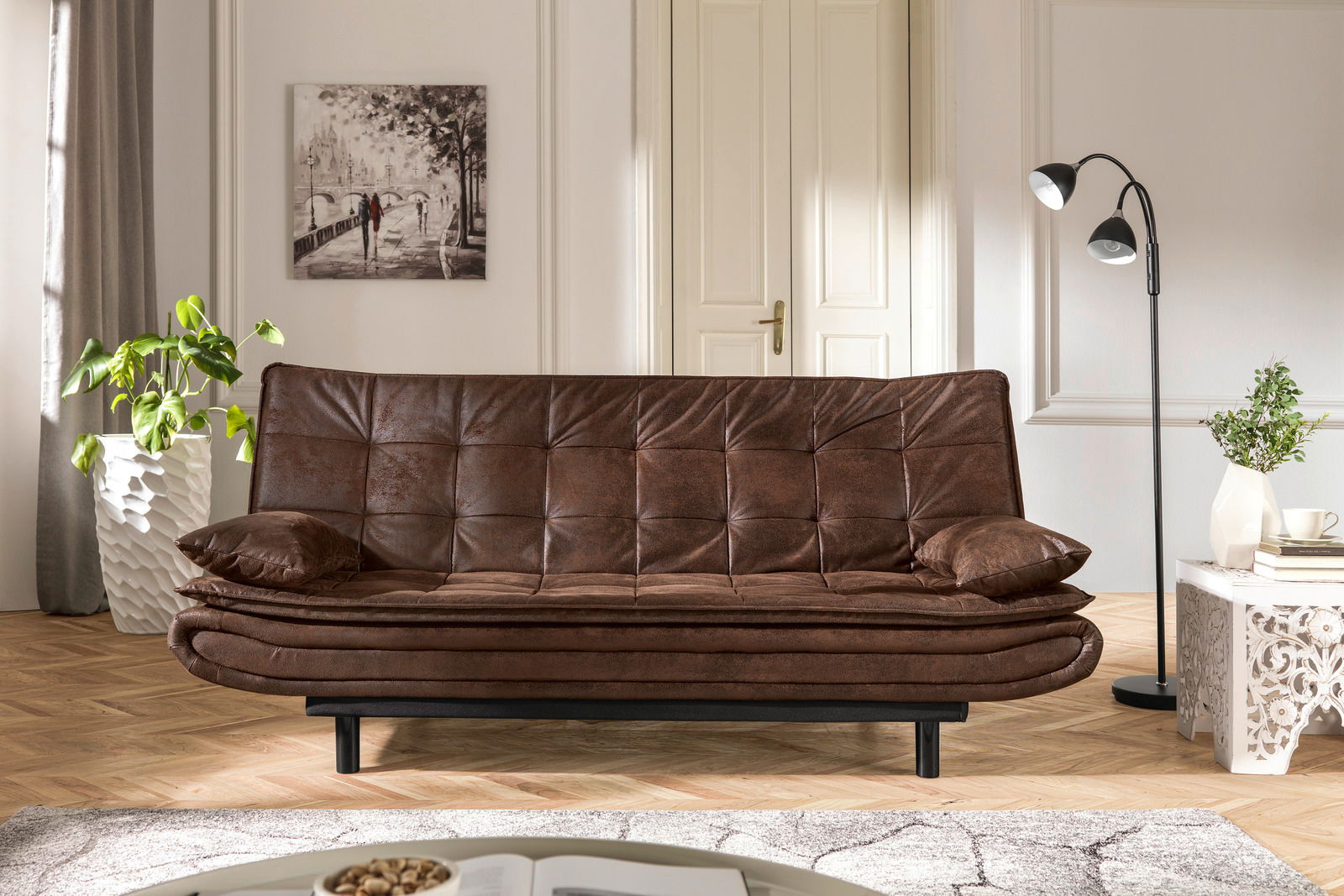 Mit dem Ti´me Schlafsofa "GHOST" erzielen Sie einen außergewöhnlichen Blickfänger zum modernen Landhaus- sowie Skandiambiente. Sein durchgehender Stoffbezug in Madagaskar-Braun mit Used-Optik sowie schwarze Kunststofffüße verleihen dem Möbel rustikales Flair.