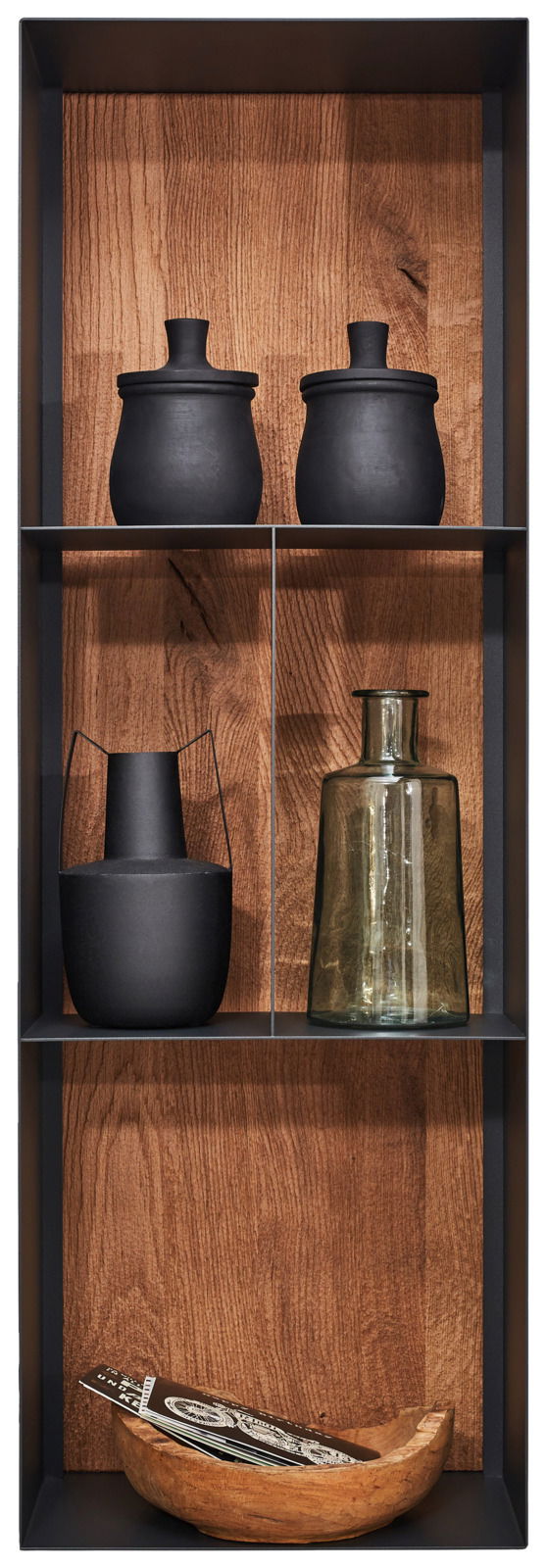 Zur gleichnamigen Möbelserie ist das Valnatura Regal "LIVINO" ein praktischer sowie stimmiger Raumpartner. Die braune Riffholzrückwand durchbricht dabei die puristische Industrienote des geradlinigen anthrazitfarbenen Metallkorpus und sorgt für ein stimmungsvolles Gesamtbild. Diese verträgt sich mit jedem Farbklima im angesagten Einrichtungstrend.