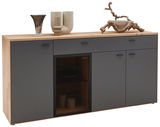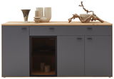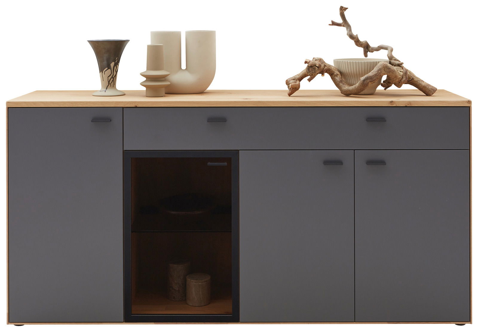 Das Sideboard VALS von Valnatura überzeugt mit seinem natürlichen und massiven Design. Gefertigt aus Teilmassivem Material in der Farbe Graphit, passt es perfekt in jeden Wohnraum. Mit den Maßen von B/H/T ca. 181,90 x 89,50 x 45,20 cm ist es sowohl geräumig als auch platzsparend. Trotz des Gewichts von 98,60 kg lässt es sich durch die praktischen Metallgriffe leicht bedienen. Das Sideboard verfügt über vier Drehtüren, davon eine aus Klarglas, und eine Schublade. Die Vorderseite in Wildeiche und der Korpus in Wildeiche Massiv soft gebürstet, kombiniert mit der Front in Lack graphitgrau, sorgen für einen stilvollen Look. Erwerben Sie jetzt dieses stilvolle Möbelstück und bereichern Sie Ihren Wohnraum um ein echtes Highlight.